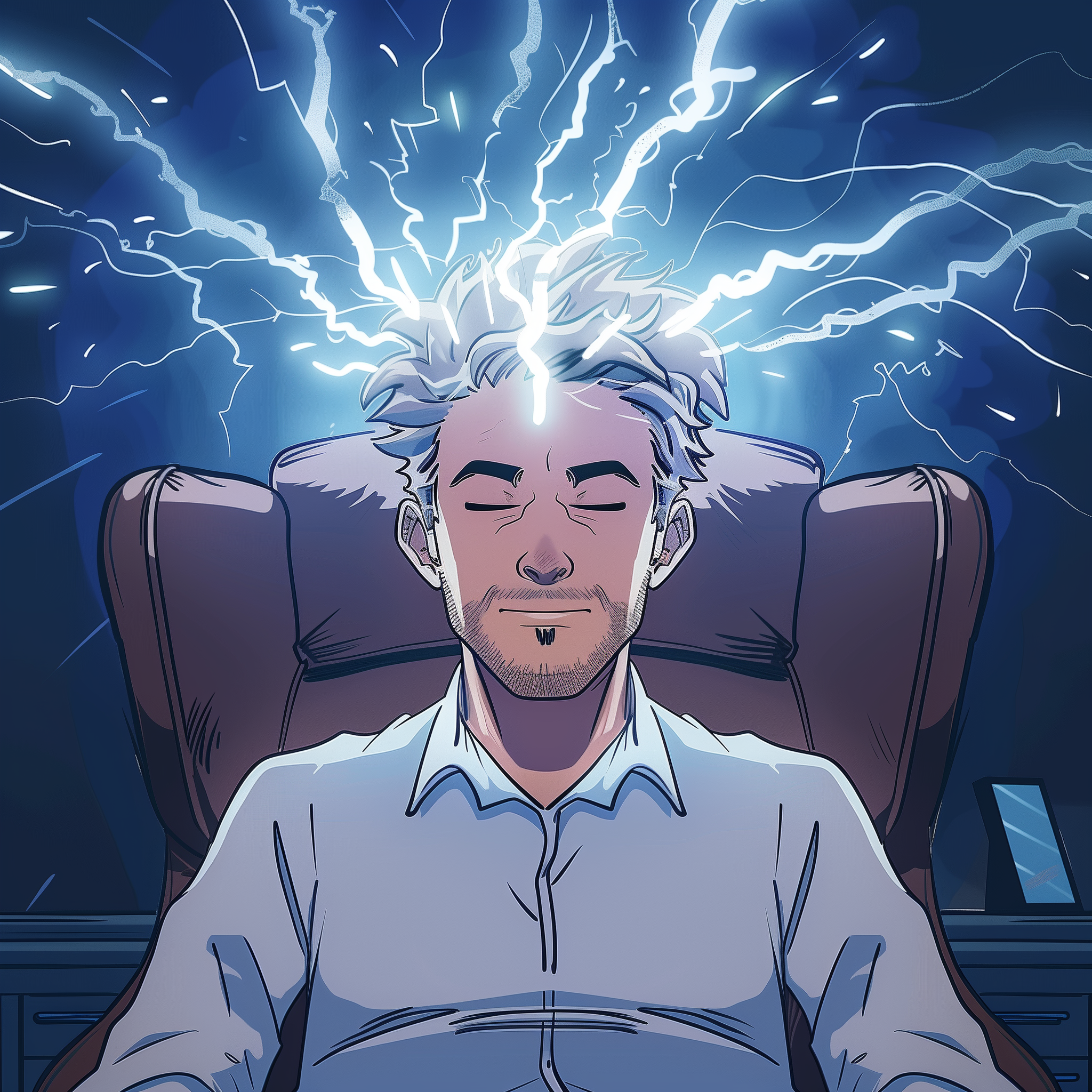 A man sitting in a nice office chair with his eyes open, revealing a thunderstorm with lightning inside his brain, conveying deep thoughts and contemplation. The cartoon style illustration captures the complex emotions and inner workings of the mind.