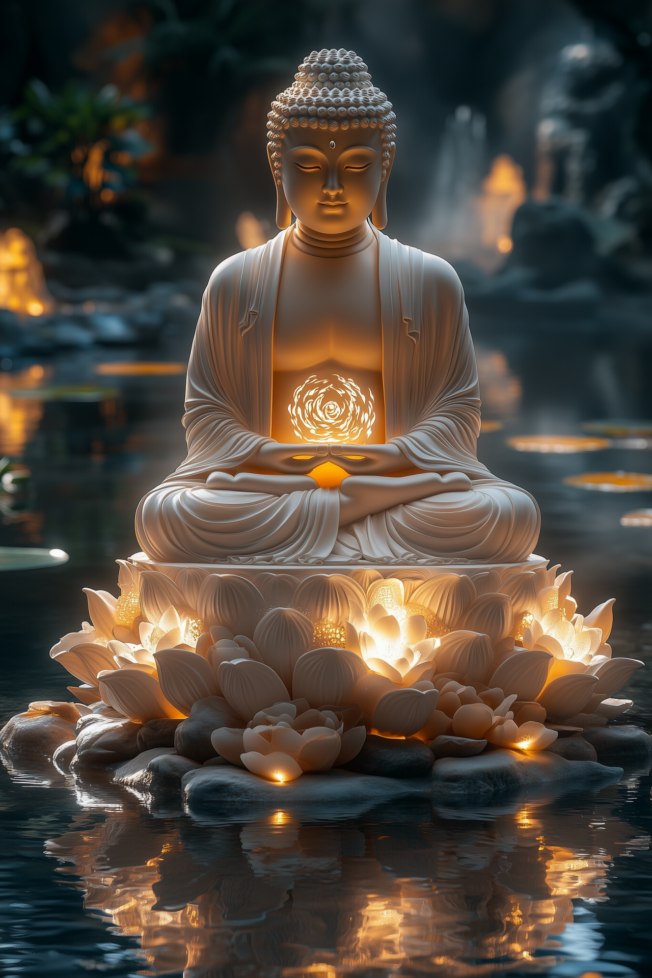 This image showcases a stunning minimalist Buddha statue viewed from above, suspended gracefully over a serene mirrored lake. The tranquil setting is enhanced by spirals surrounding the statue, creating a harmonious and meditative atmosphere.