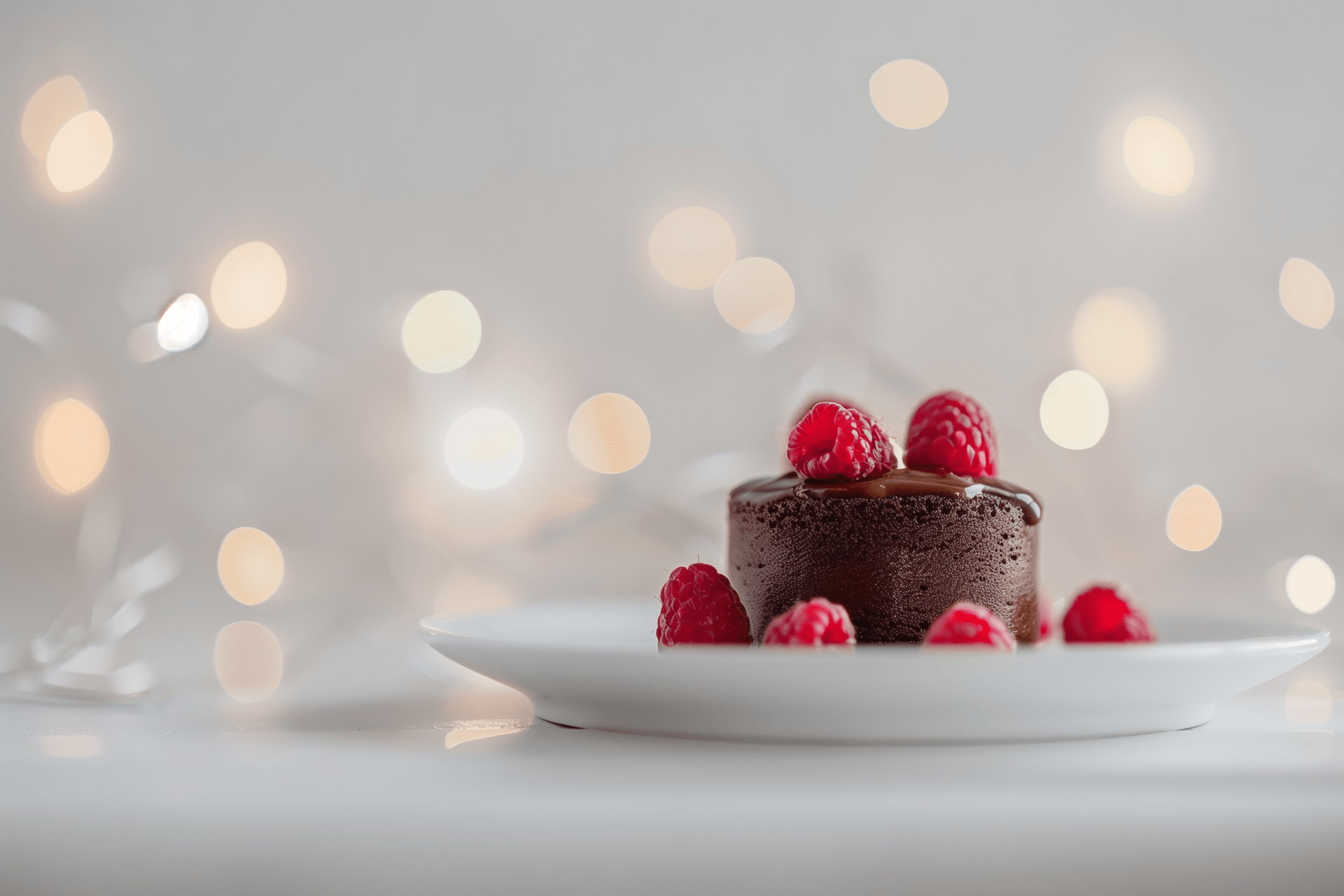 This image showcases a minimalist dessert table featuring a decadent chocolate mousse cake adorned with fresh raspberries and a glossy ganache. The modern white backdrop and warm fairy lights create a clean and luxurious aesthetic, emphasizing the vibrant colors and perfect symmetry of the setup.