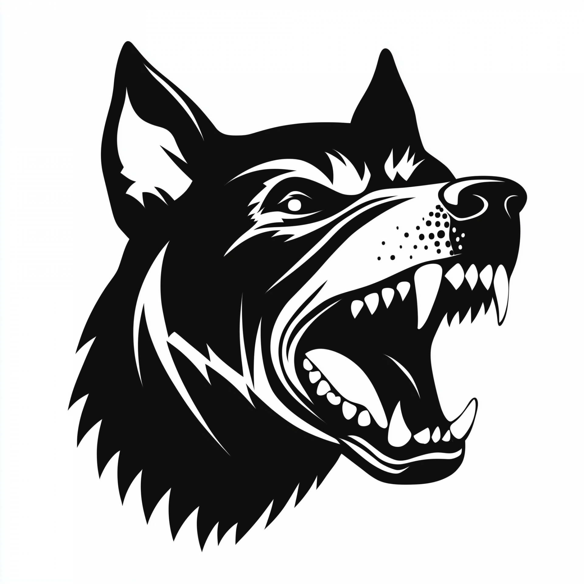 This illustration showcases a black and white silhouette of an angry dog with bared teeth in a profile view. The design is minimalistic and flat, set against a solid white background, emphasizing high contrast and simplicity.