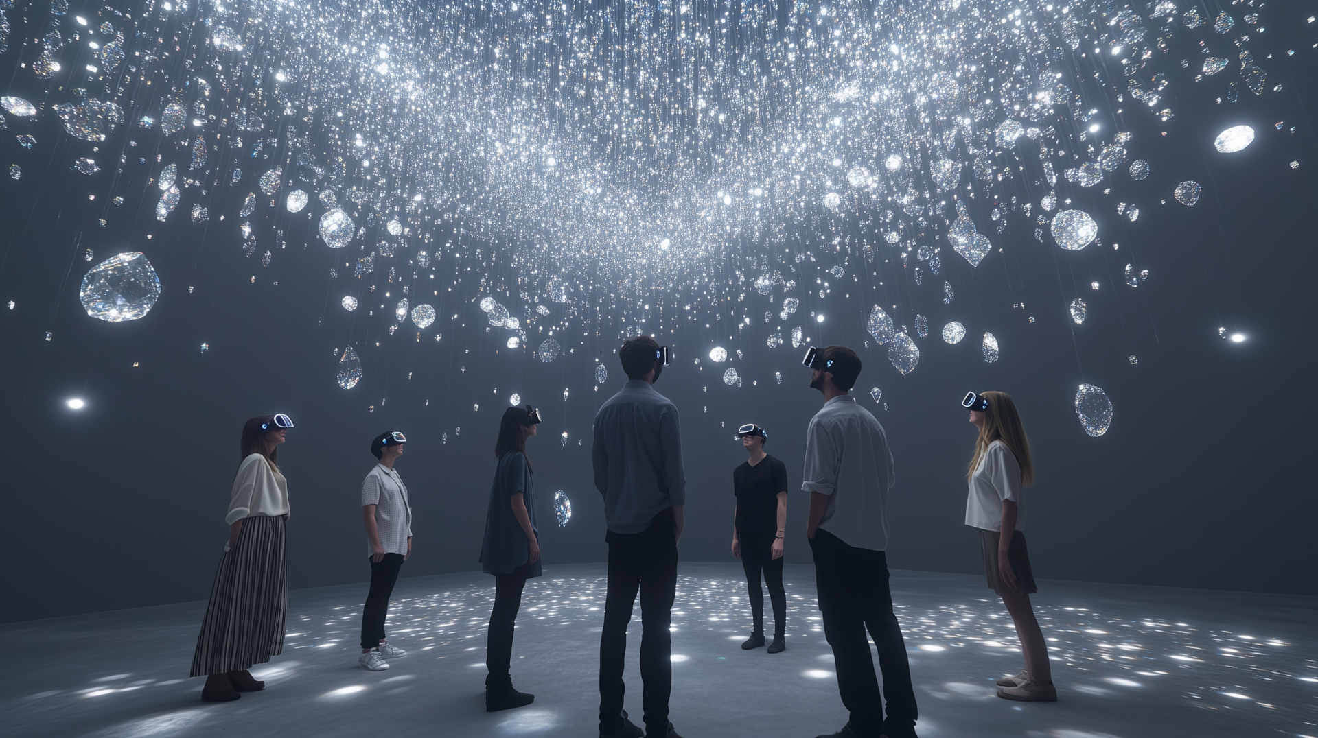 Eight individuals are gathered in a spacious, minimalist environment that feels both contemporary and serene. The setting features a smooth, dark gray floor and a collection of shimmering gemstones scattered around them, creating a tranquil atmosphere.