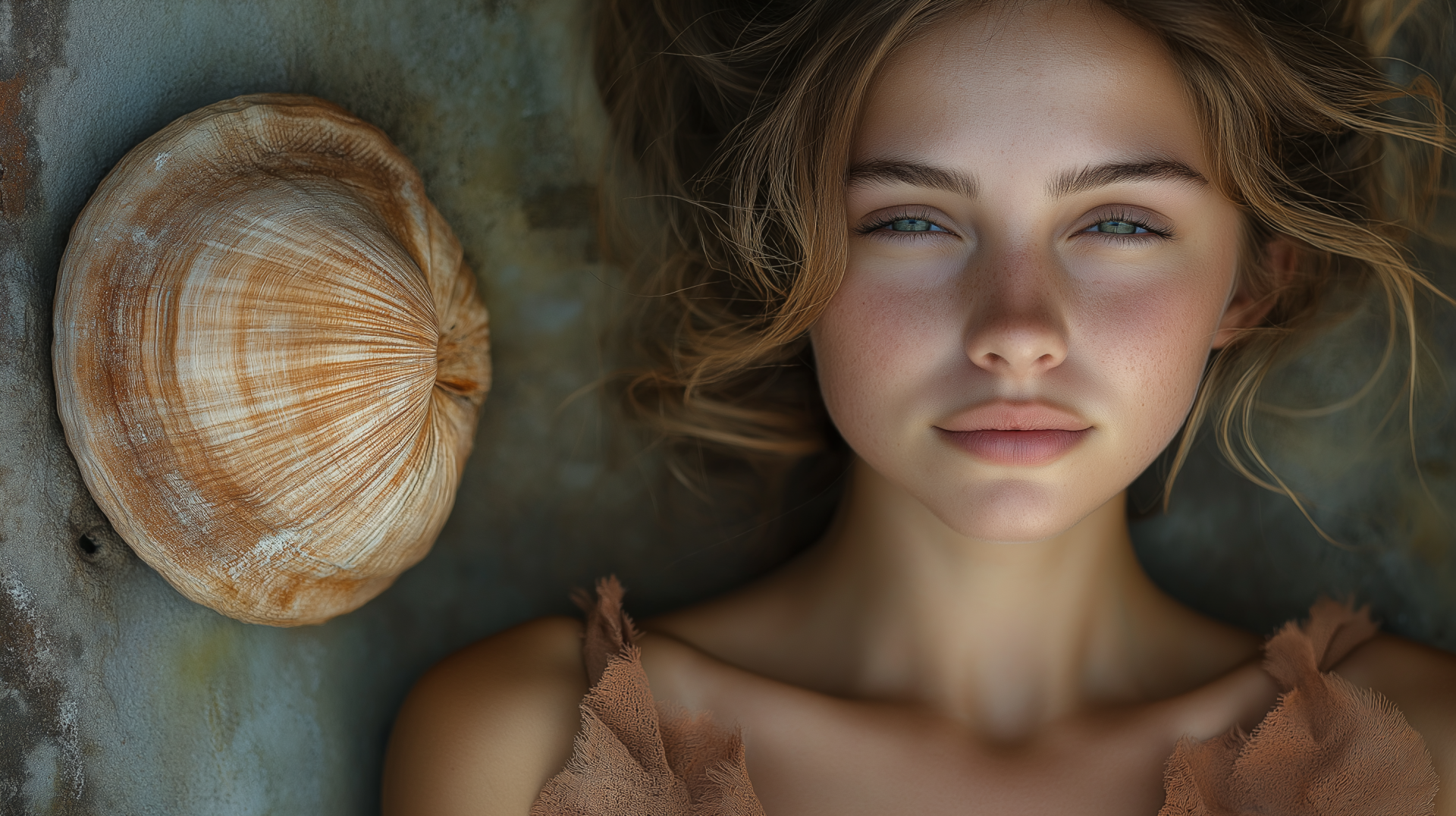 This image features a close-up portrait of a young woman dressed in a modern minimalist style. The muted colors create a serene atmosphere that emphasizes the simplicity of the fashion.