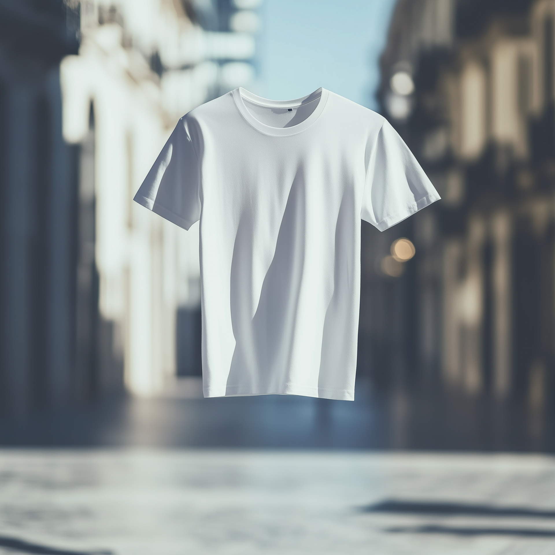 The image features a clean and simple design of a white t-shirt laid flat on a neutral background. Its minimalistic style emphasizes the smooth fabric and lack of embellishments, creating an elegant and timeless appearance.