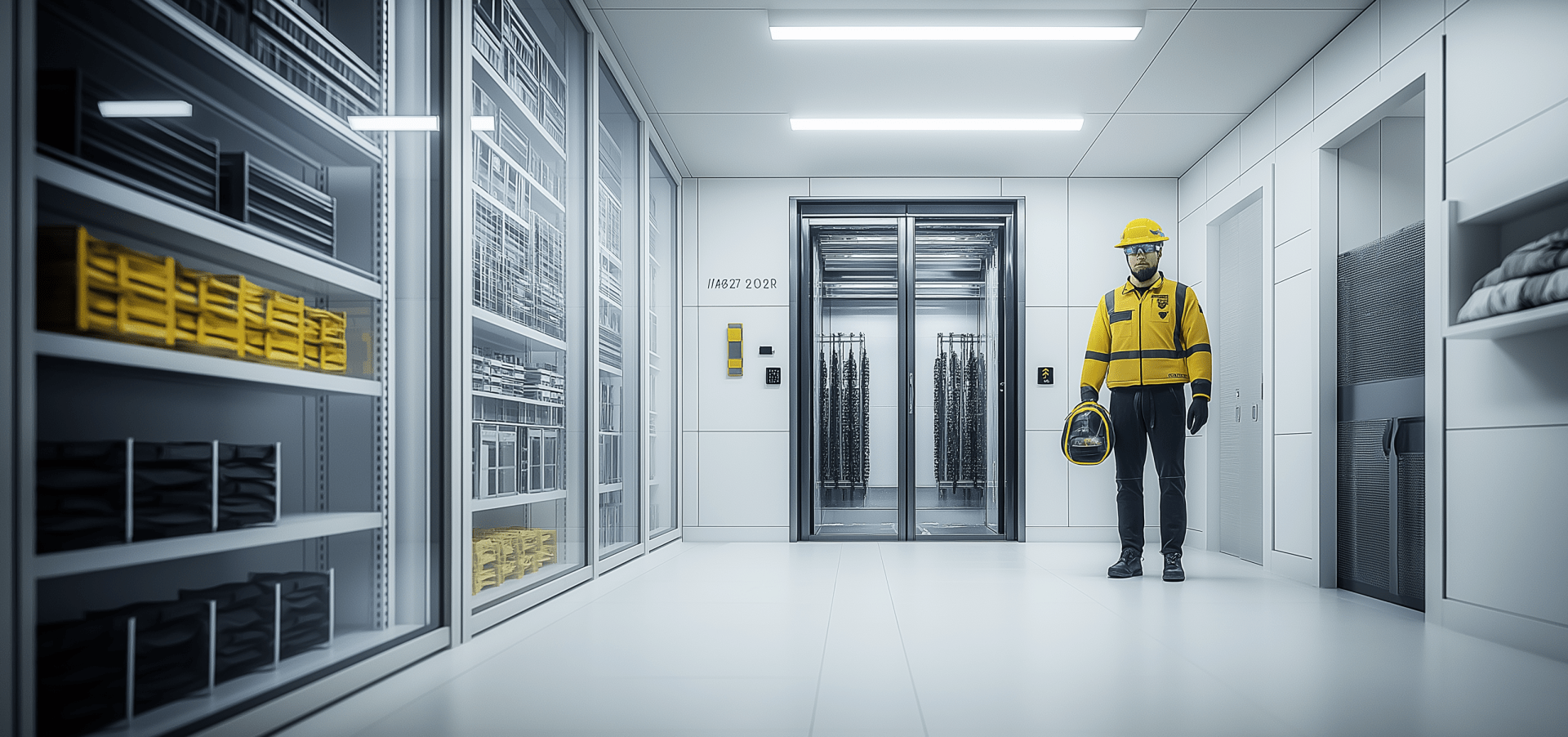 The image depicts a modern elevator entrance within a coal mine, characterized by a stark contrast between the white walls and the glass window. The light tile flooring adds a bright touch to the otherwise industrial setting.
