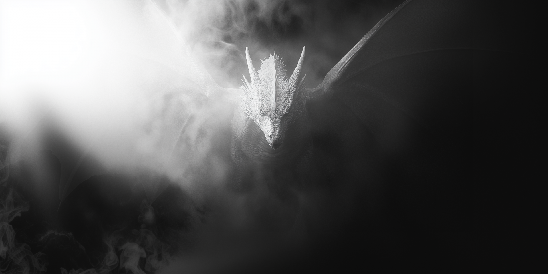 This illustration features a majestic white dragon shrouded in mist, embodying a sense of mystery and protection. Its powerful presence resonates with the ethereal landscape, creating an aura of the unseen and the unknown.