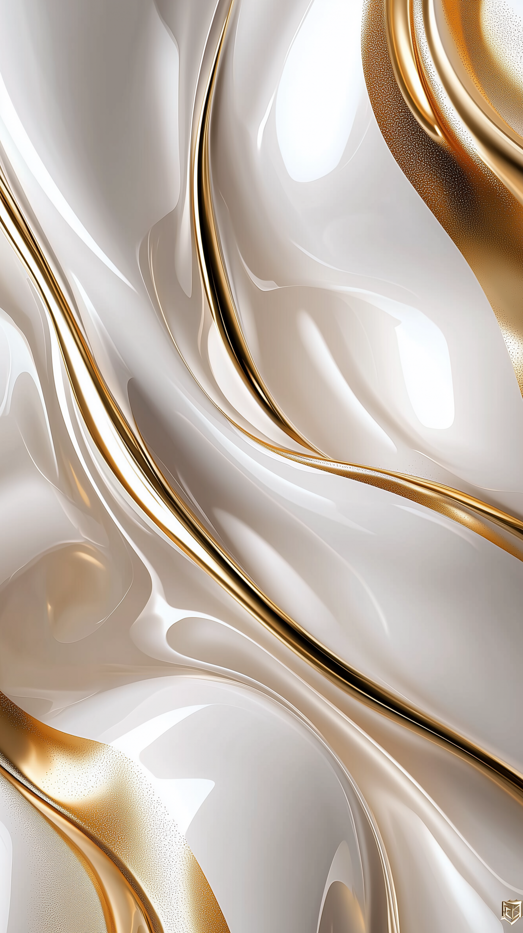 This image features a sleek white and gold abstract design characterized by smooth curves and fluid lines. The glossy finish and metallic elements create a luxurious and modern aesthetic.