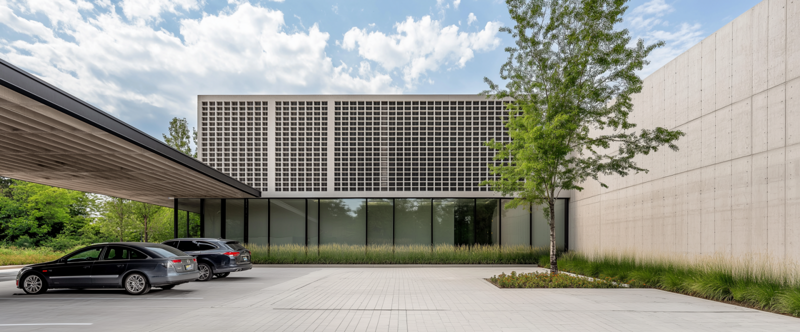 The image showcases a modern architectural design featuring a courtyard with precast concrete elements. The structure is characterized by its boxy modular shapes and a dialogical open space that invites multiple interpretations.