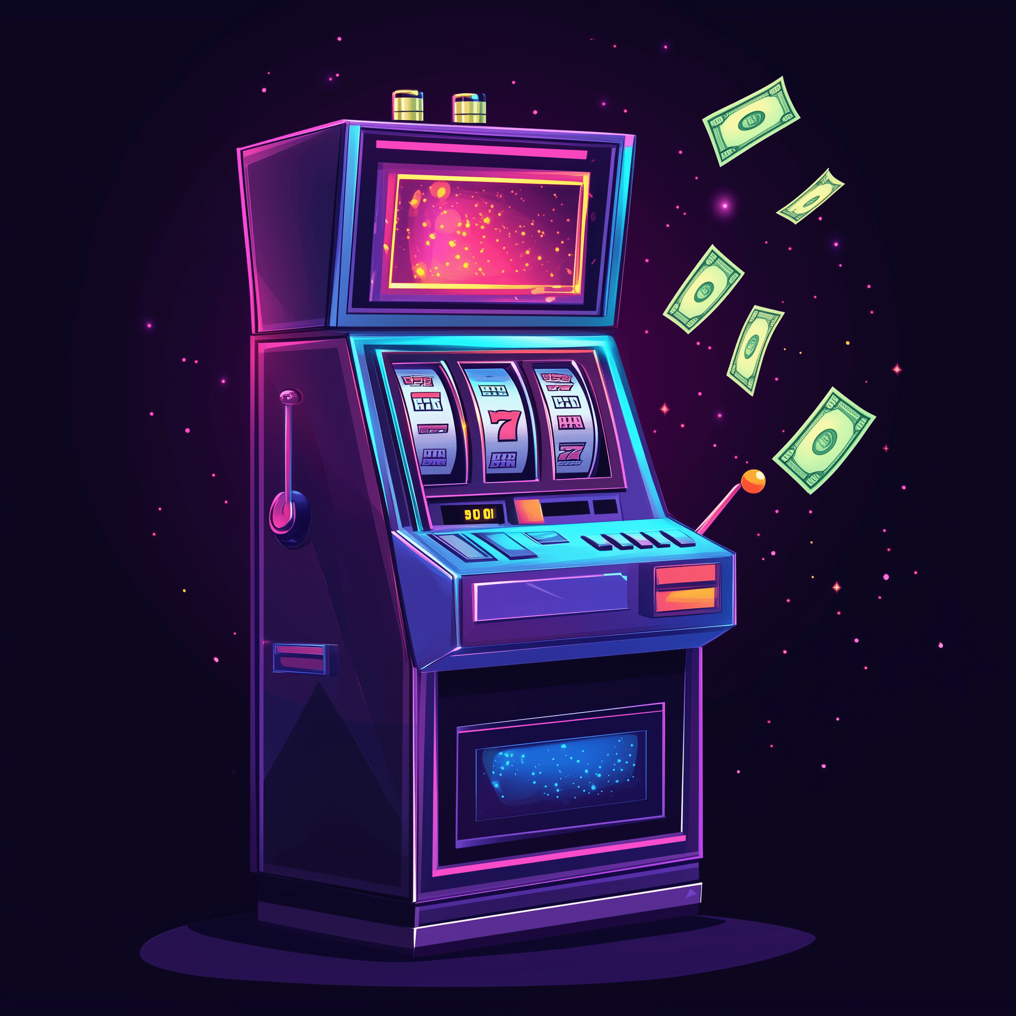 This flat vector image showcases a modern animated digital slot machine with vibrant colors. You can see dollar bills flying out from the sides, creating a lively and exciting atmosphere.