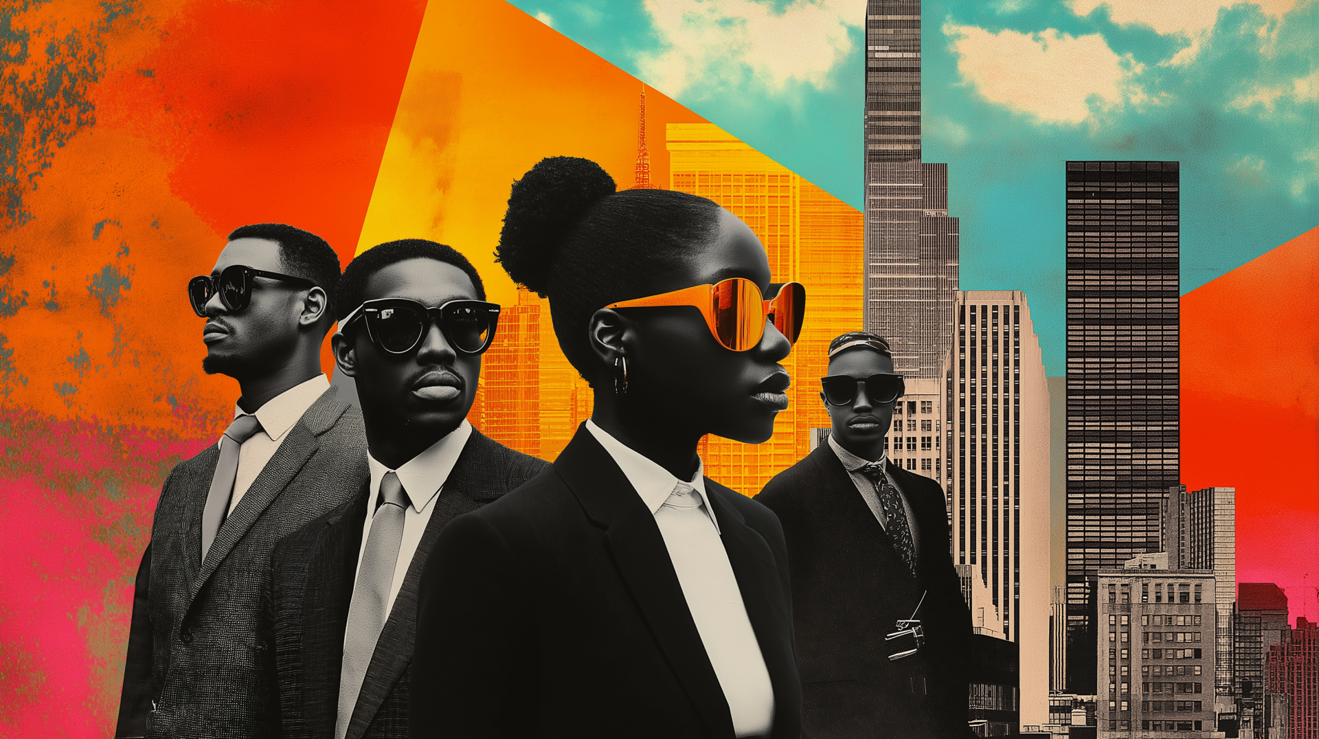 This illustration features a vibrant collage of black business men and women set against a backdrop of ultramodern skyscrapers. The piece blends elements of luxury fashion and creativity, evoking a warm, contemporary feel infused with an afrofuturistic aesthetic.