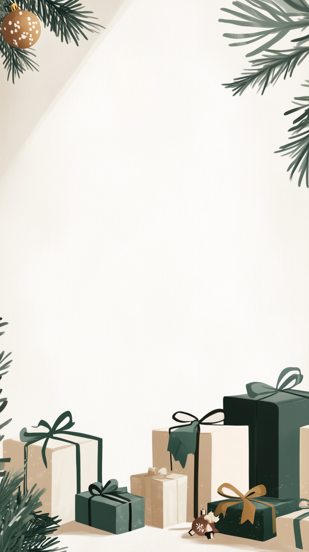 The image features a clean and minimalist arrangement of Christmas gifts in the corners. It showcases a warm and inviting atmosphere, enhanced by soft lighting and a neutral color palette that includes pops of green and white.