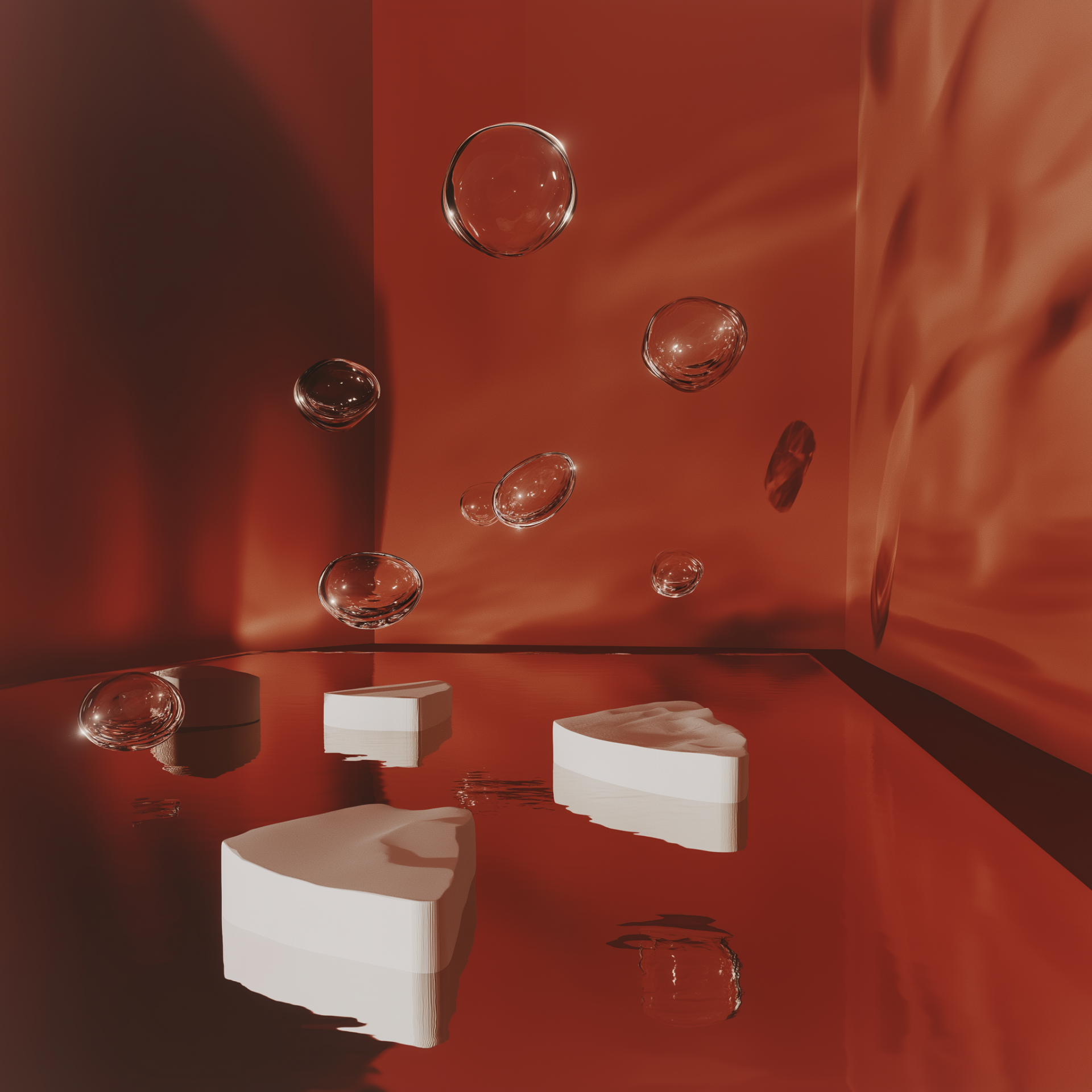 The image features a striking red background filled with various glass shapes that appear to be floating. The studio setting gives it a modern and abstract feel, creating a dynamic and lively atmosphere.