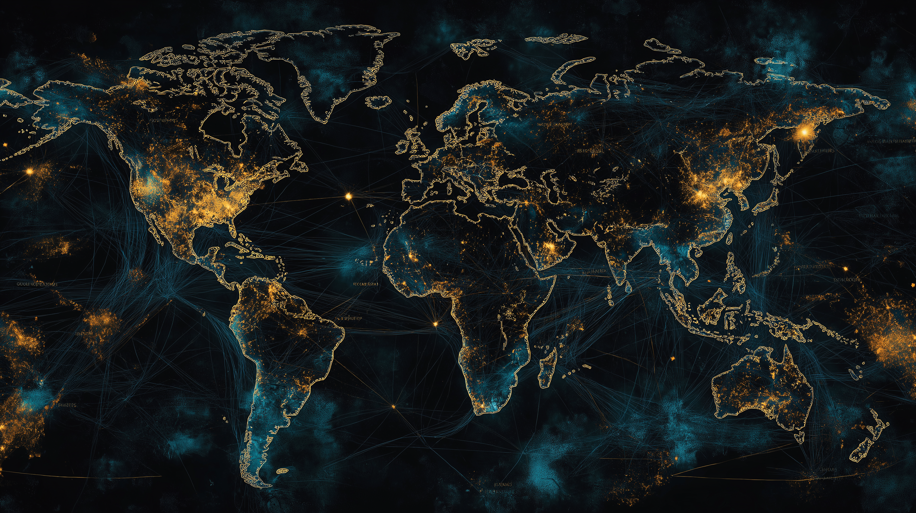 This illustration features a striking map of the world in black, blue, and gold tones. Thick lines connect various dots, conveying themes of technology and global connectivity.
