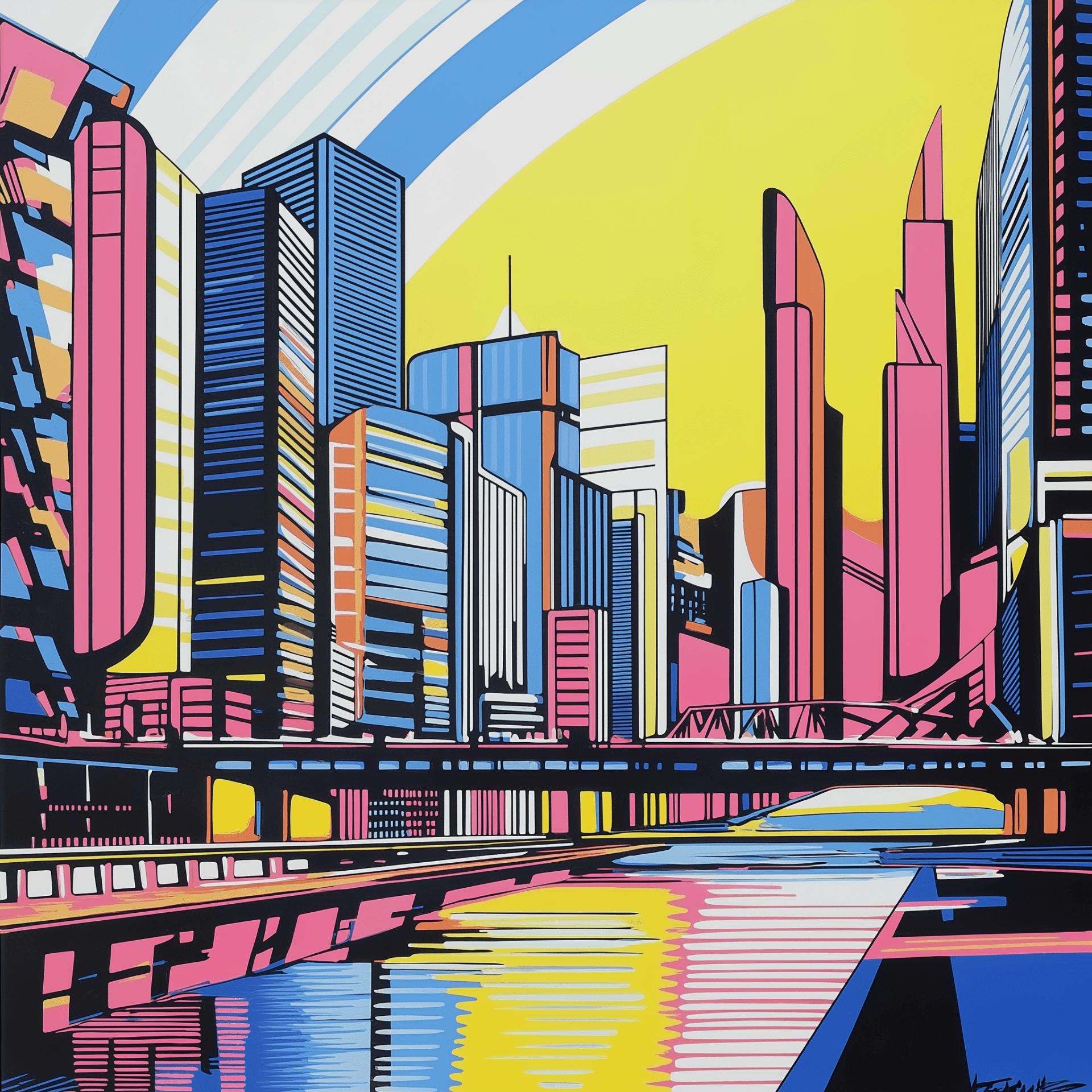 The image features a vibrant and colorful skyline set against a flowing river, infused with a cinematic atmosphere. Its pop art style, reminiscent of Roy Lichtenstein, showcases bold colors and dotted patterns, creating a striking visual impact.