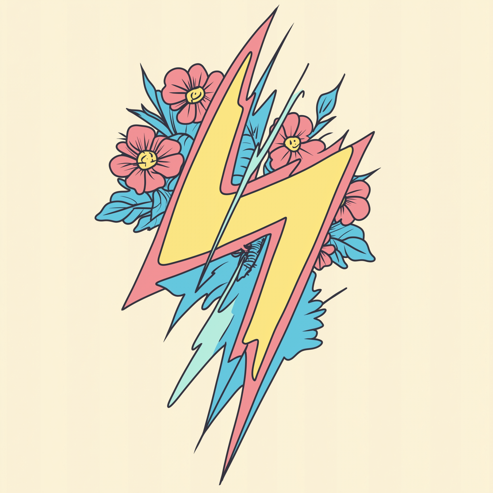 This illustration features a vibrant lightning bolt icon designed in a modern Korean art style. The bold design is complemented by a floral background, creating a unique and eye-catching tattoo concept.