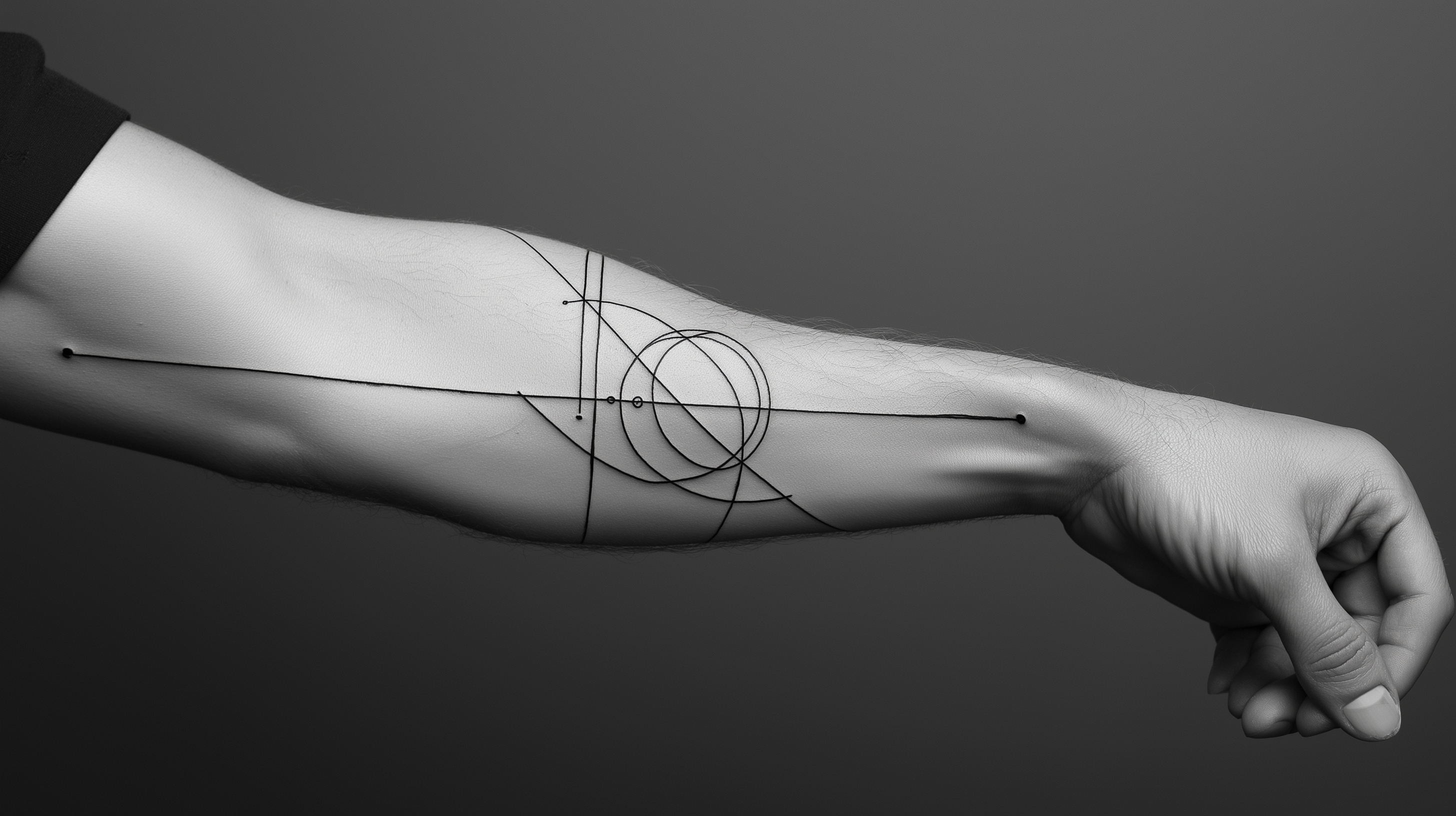 This image showcases a minimalist tattoo design featuring clean black lines that create geometric shapes and delicate curves. The modern design flows seamlessly along the forearm, emphasizing simplicity and elegance.