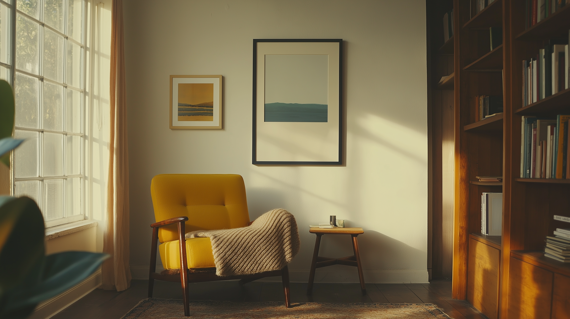 The image shows an empty vertical picture frame on a white wall inside a modern cabin. The room is minimalist, featuring a couple of cozy chairs, one adorned with a throw blanket, creating a warm and inviting atmosphere.