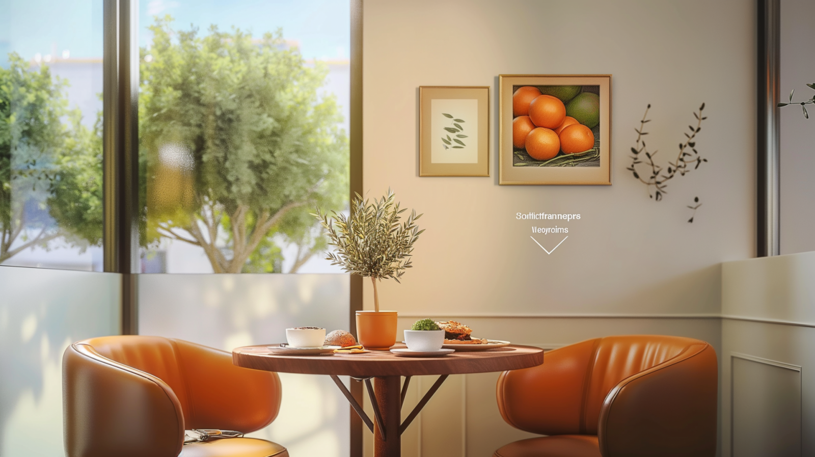 The image showcases a cozy and minimalistic modern cafe interior, featuring two orange leather chairs arranged around a small round wooden table adorned with food and coffee. Soft beige walls and framed modern art complement the scene, while a large window reveals green trees under a blue sky, creating a soothing and inviting atmosphere.