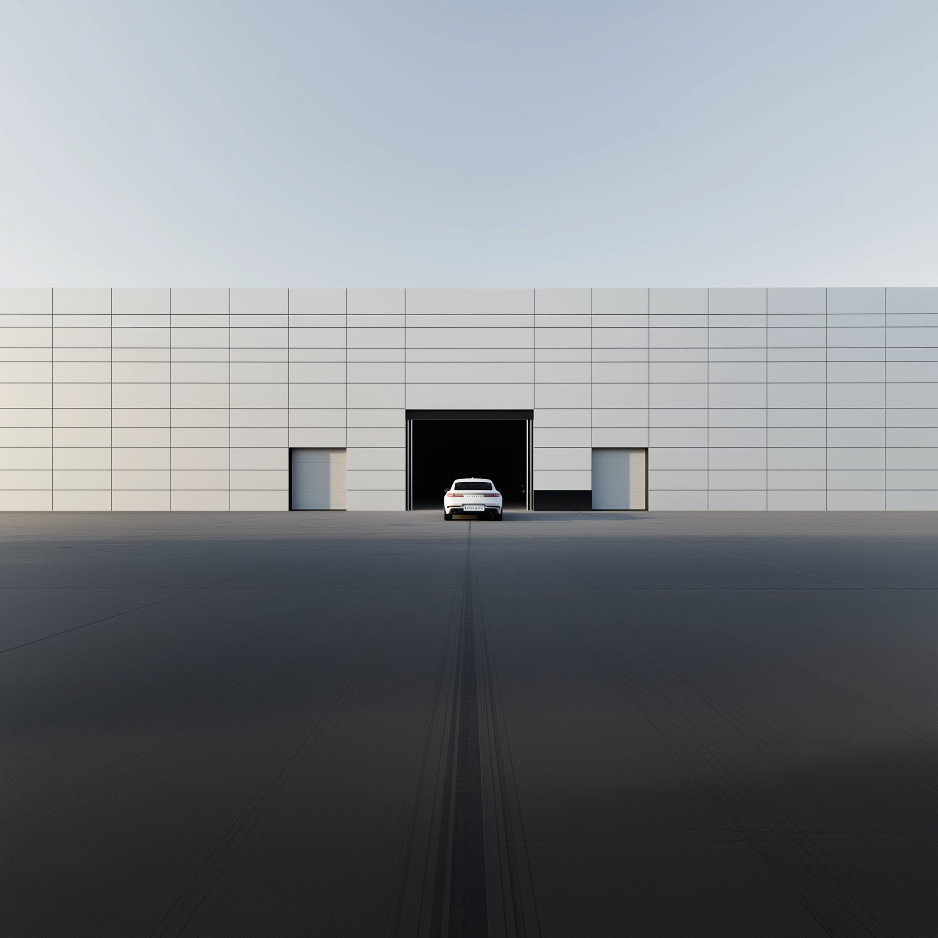 The image captures a sleek white Genesis GV70 as it drives out of a modern high-tech garage. The early morning light creates a cinematic atmosphere, highlighting the vehicle against the pristine factory backdrop.