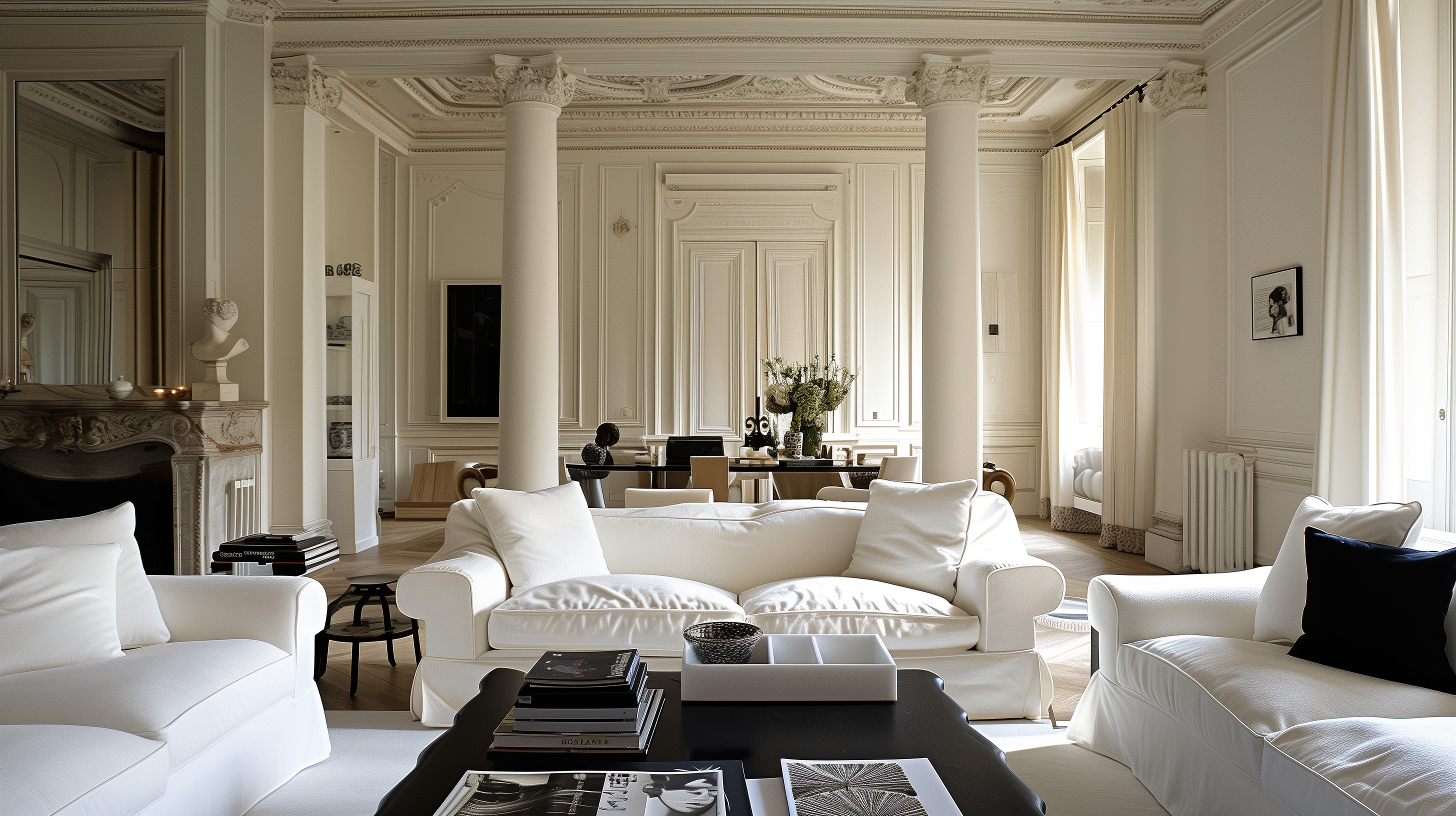 A high-resolution photo of a Greek Revival living room featuring elegant architectural details. The room exudes a modern and sophisticated ambiance with white modern slipcovered sofas reminiscent of Givenchy and a stylish black coffee table.