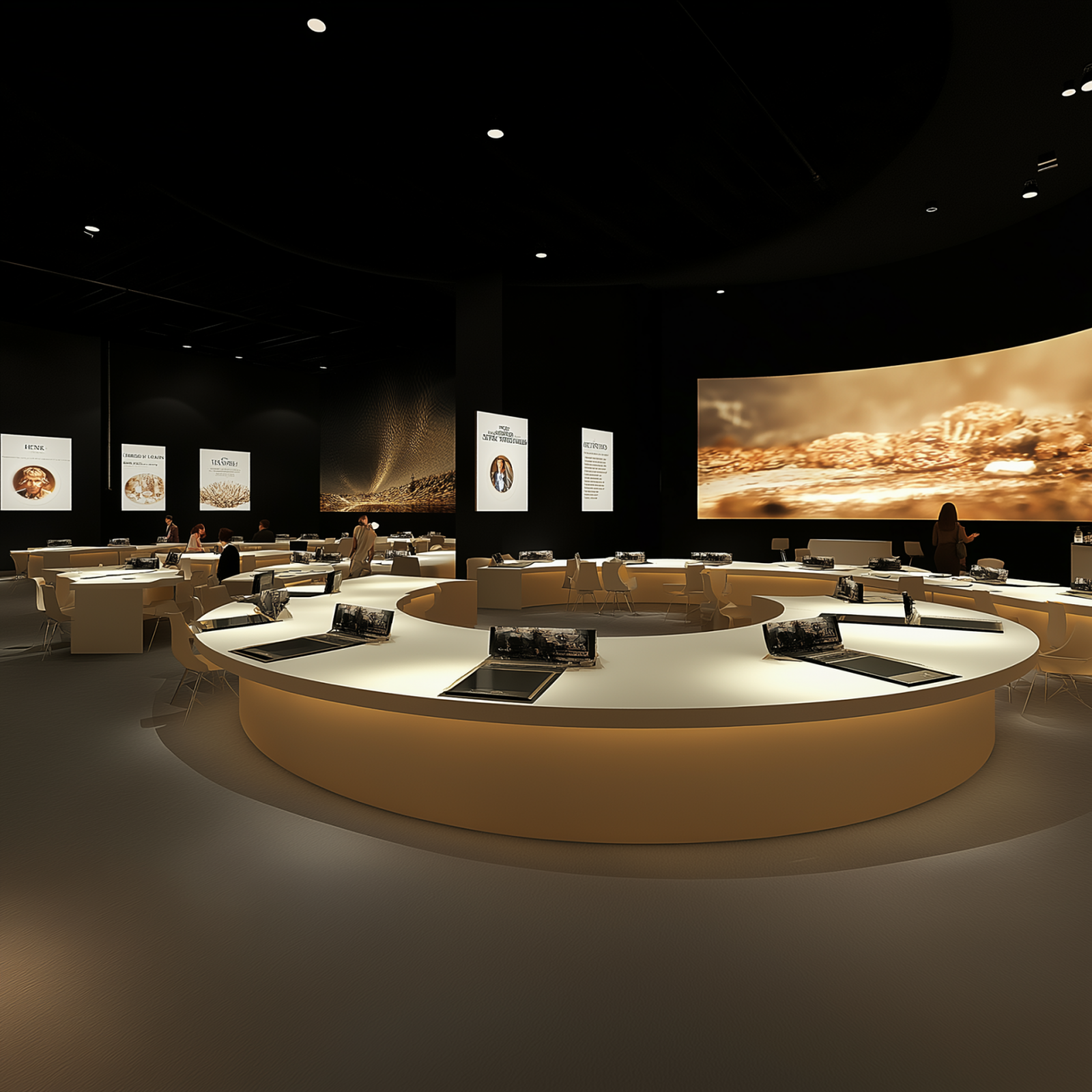 This image showcases a modern and sophisticated round table discussion area set within a spacious exhibition space. The atmosphere is one of collaboration and engagement, featuring elegant furniture and digital screens that enhance the professional environment.