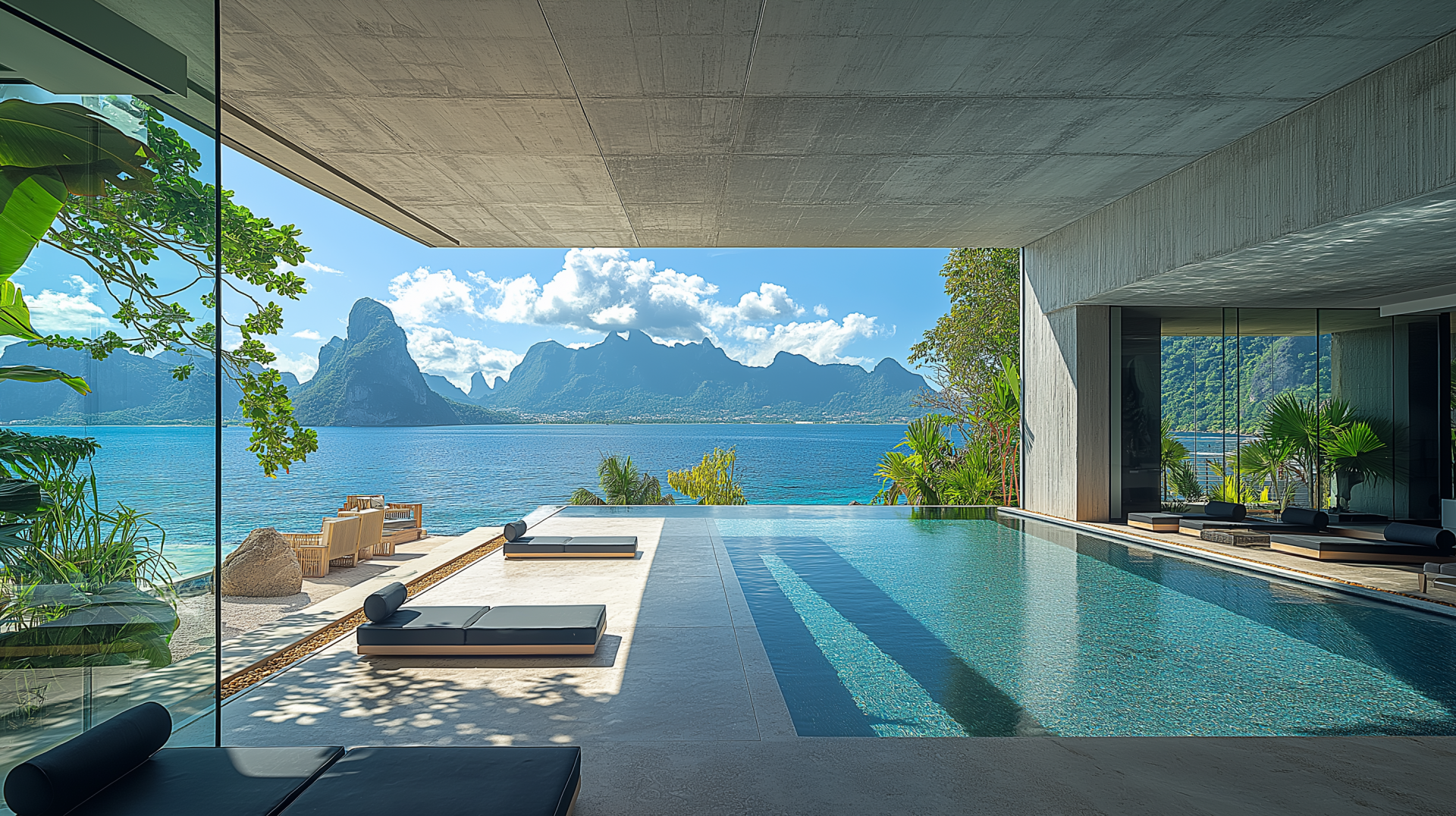 The image features a modern gym with glass walls that provide an expansive view of the sea. With a sleek white ceiling and state-of-the-art black weights, the space radiates a futuristic and elegant atmosphere.