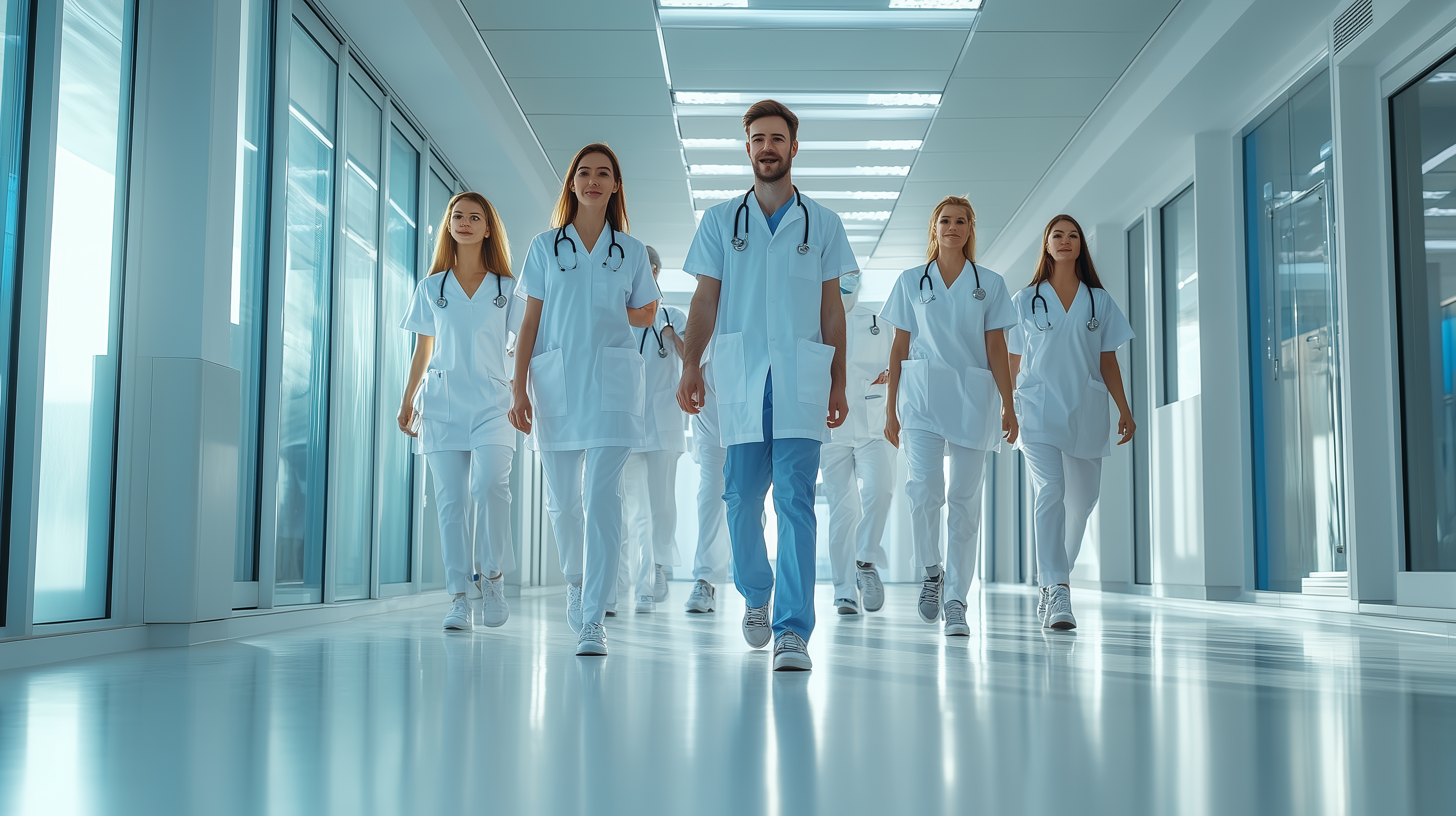 This image features a team of healthcare professionals wearing elegant uniforms, working collaboratively in a minimalist clinic environment. The photorealistic style conveys a sense of professionalism and calmness, highlighting the teamwork amongst the doctors and nurses.