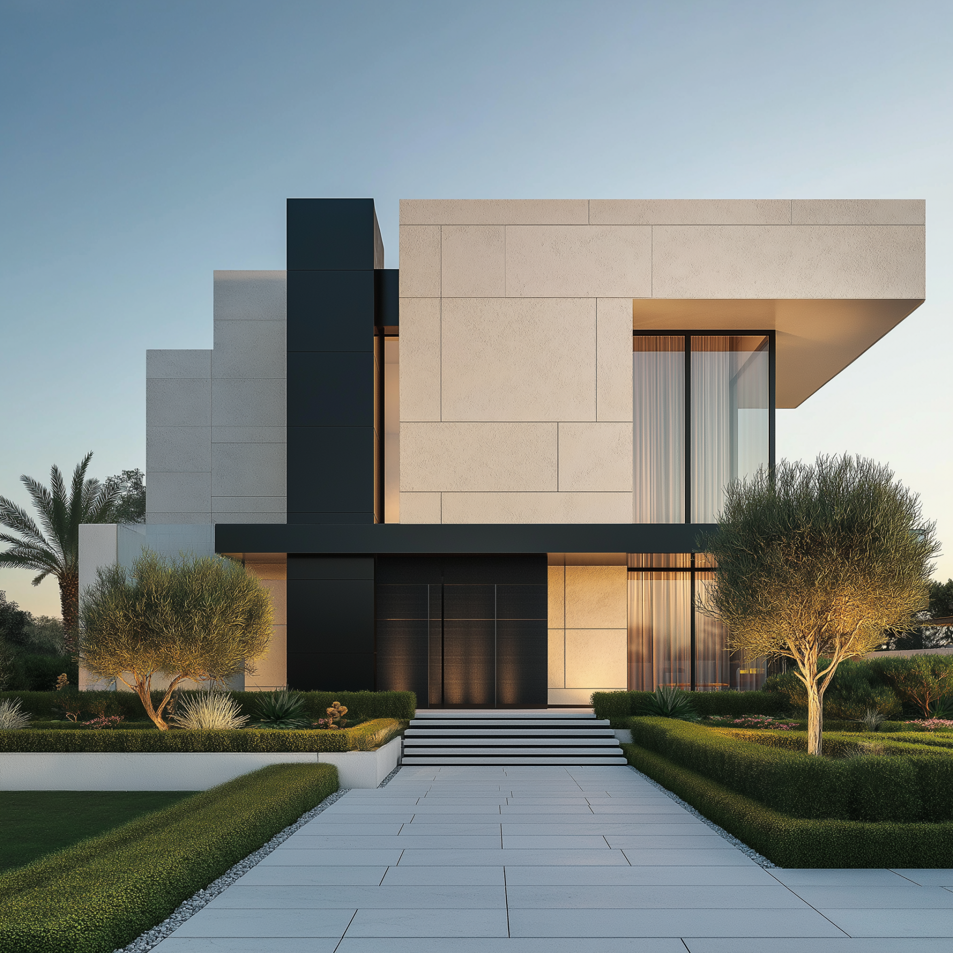 This image showcases a minimalist modern exterior of a luxury villa, set against a scenic hill backdrop. The villa features a beautifully designed wall and is surrounded by a meticulously manicured lawn and a grand driveway.