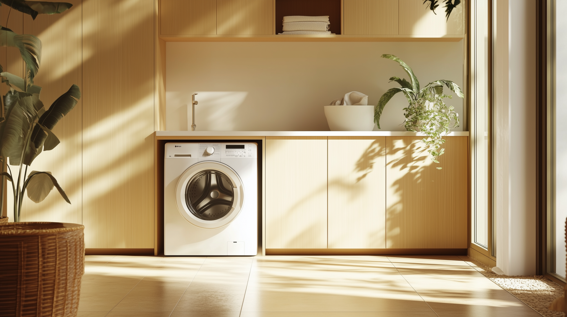 This image showcases a spacious laundry room with a fresh and light atmosphere. The modern design features a washing machine, well-organized cupboards, and plants that bring a touch of greenery to the space.