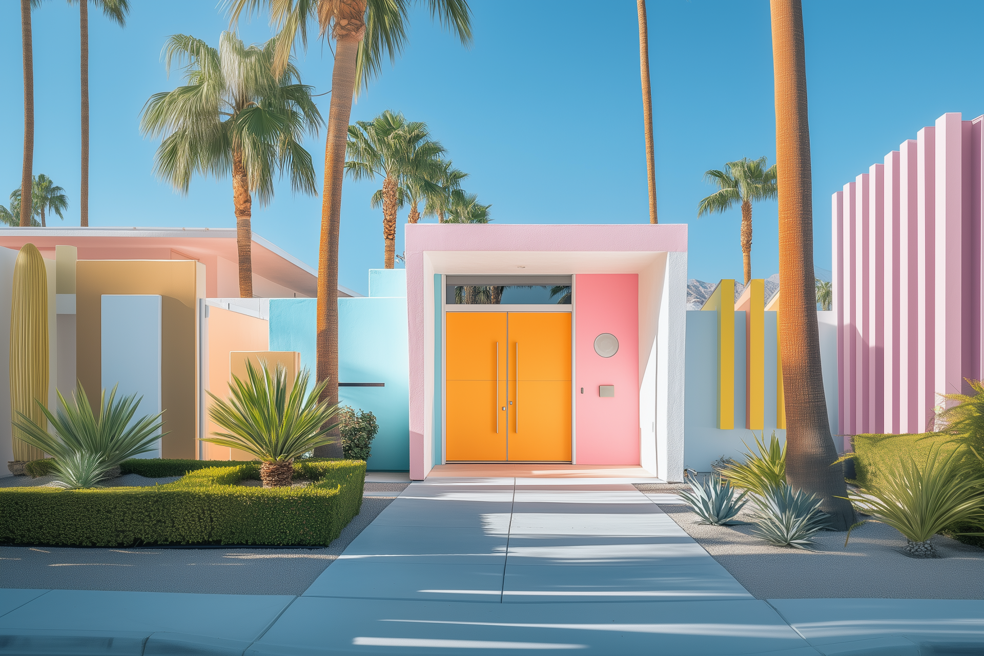 The image showcases a stylish door leading to a home in Palm Springs, adorned with soft pastel colors. The design reflects a modern aesthetic that perfectly complements the serene environment.