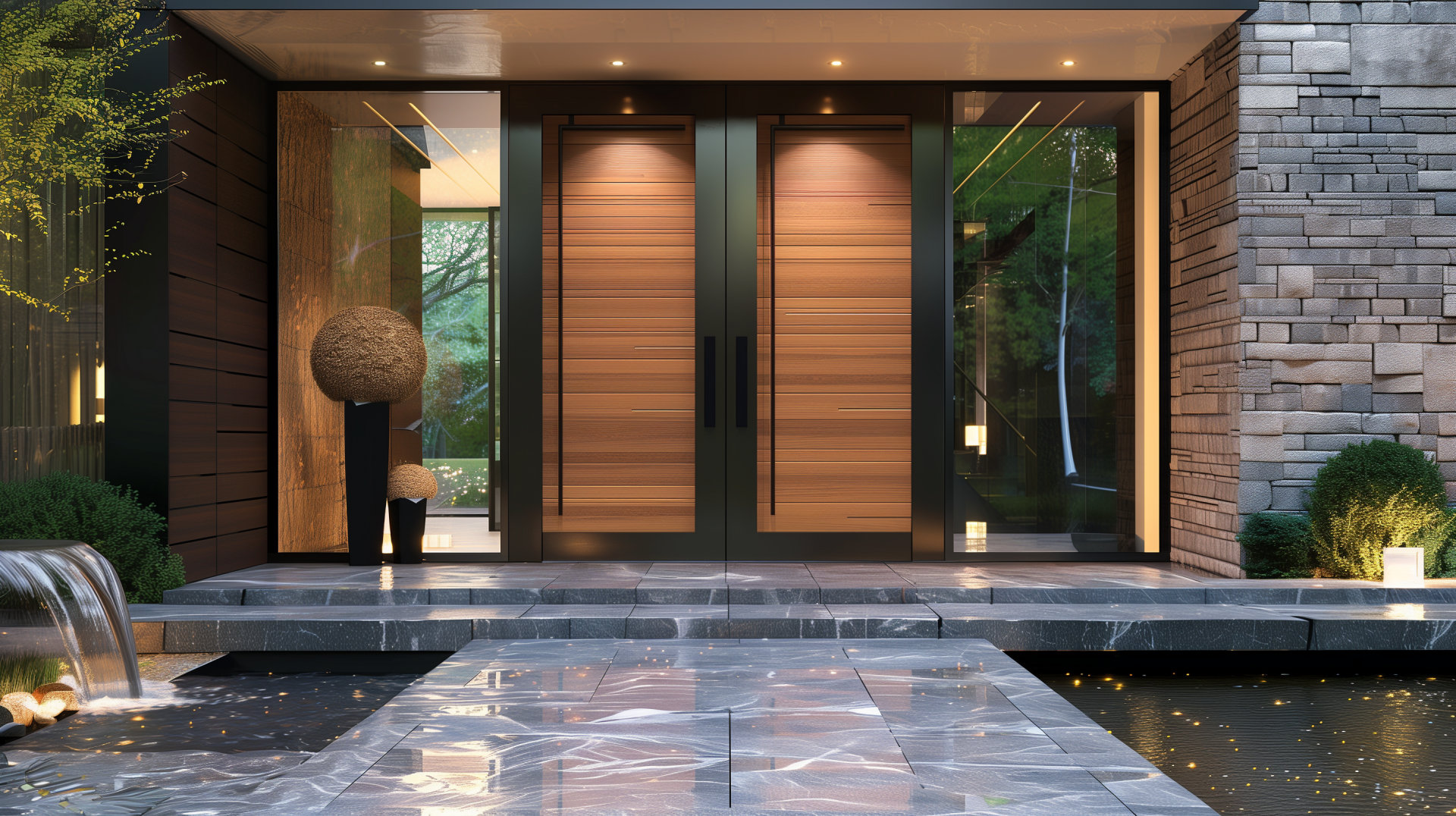This image showcases a contemporary front entrance that combines elegance with modern design. The warm teak wood doors, large glass panels, and tranquil water feature create a sophisticated and inviting atmosphere.