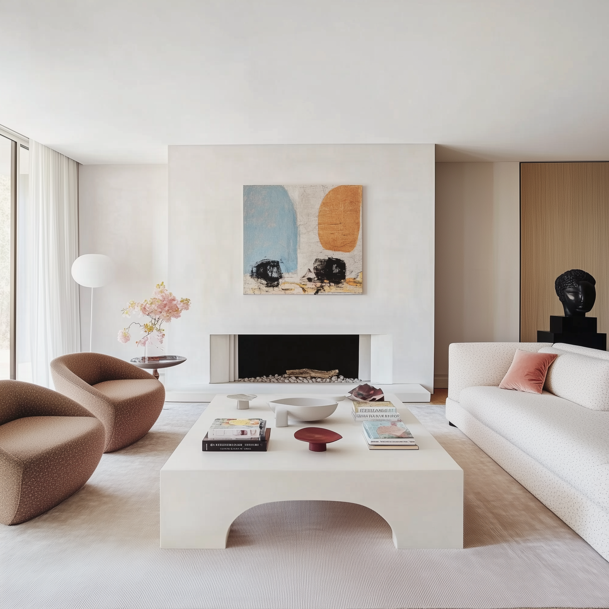 This image captures a modern living room with a fresh and inviting aesthetic. The cool white wall contrasts beautifully with soft pink accents, creating a serene yet stylish atmosphere.