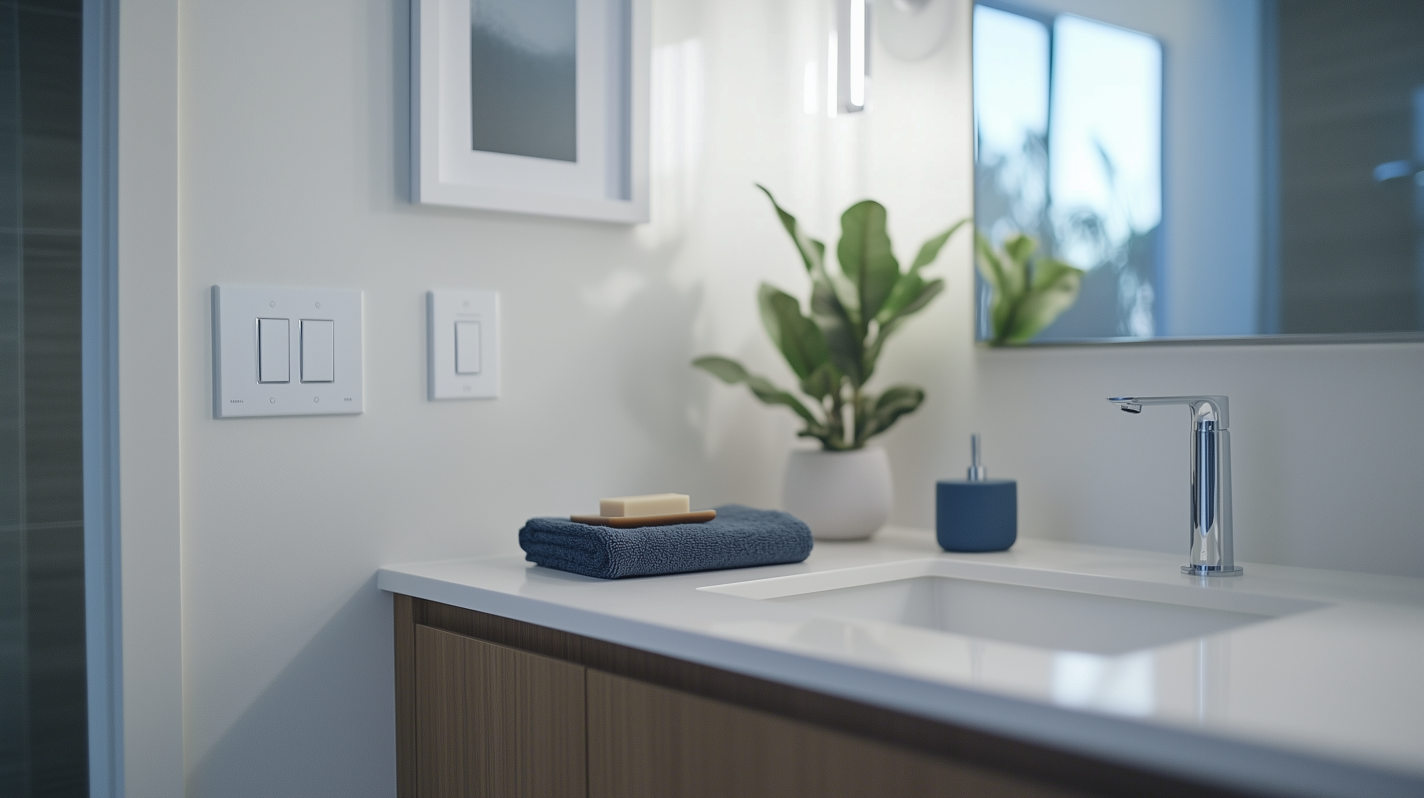 The image showcases a modern bathroom designed with clean lines and a minimalist aesthetic. A matte white wall sets a serene backdrop for the chic floating sink and thoughtful light placement.