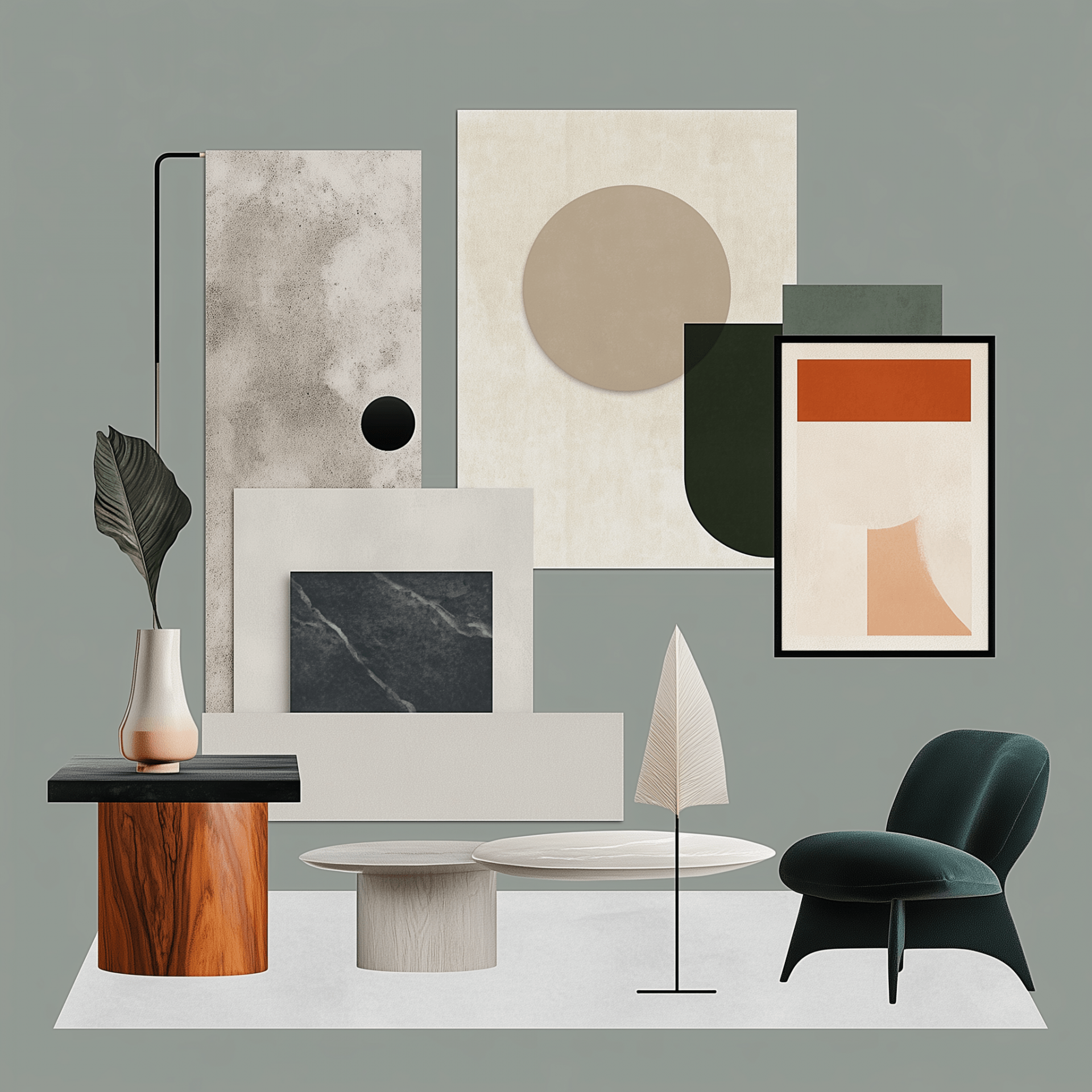 This image showcases a beautifully arranged moodboard that captures the essence of modern interior design. It features a blend of textures, colors, and design elements that inspire a contemporary aesthetic.