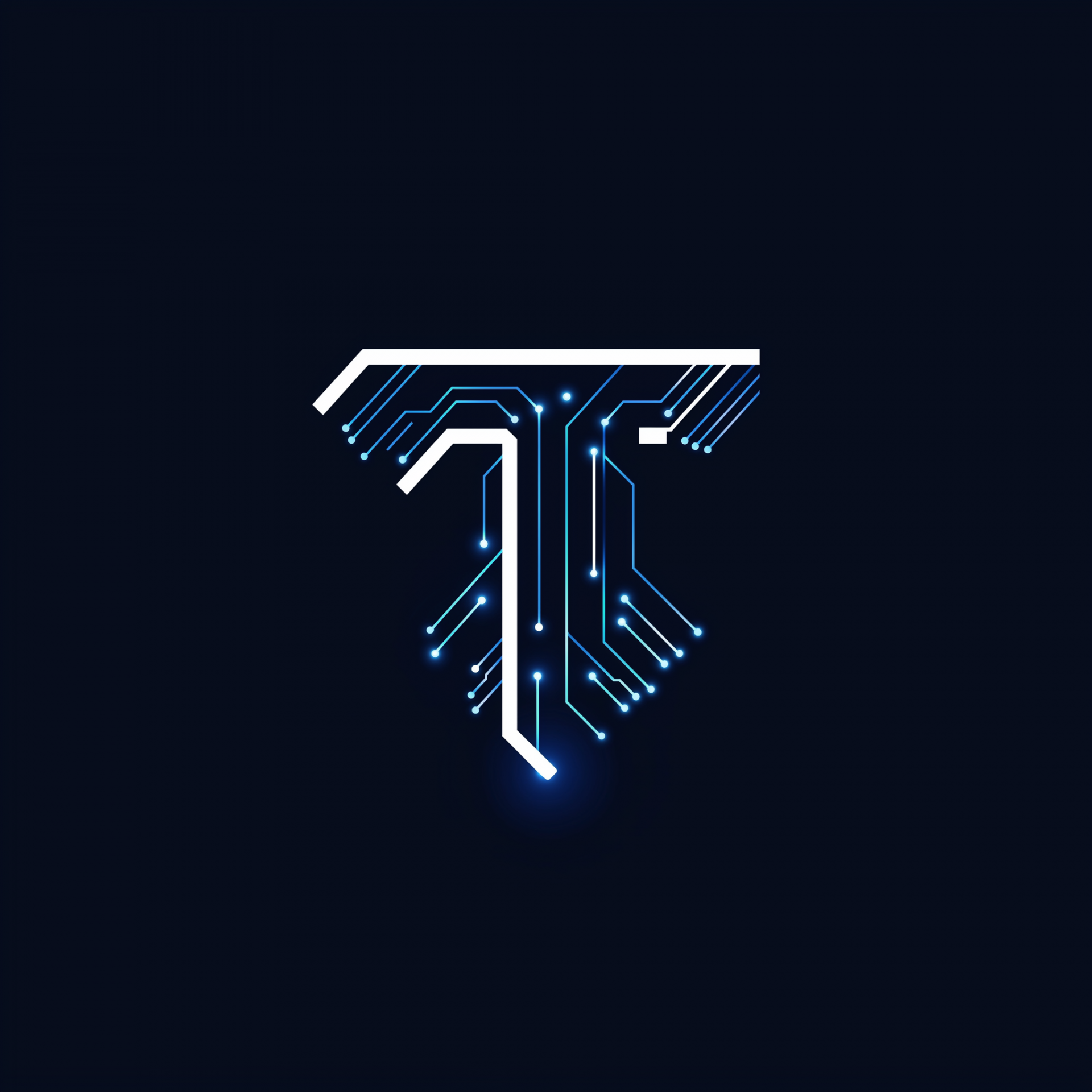 This image showcases a minimalist tech logo featuring a stylized letter 'T'. The design incorporates subtle circuit elements, presented in a modern and sleek manner with a deep blue and white color scheme.