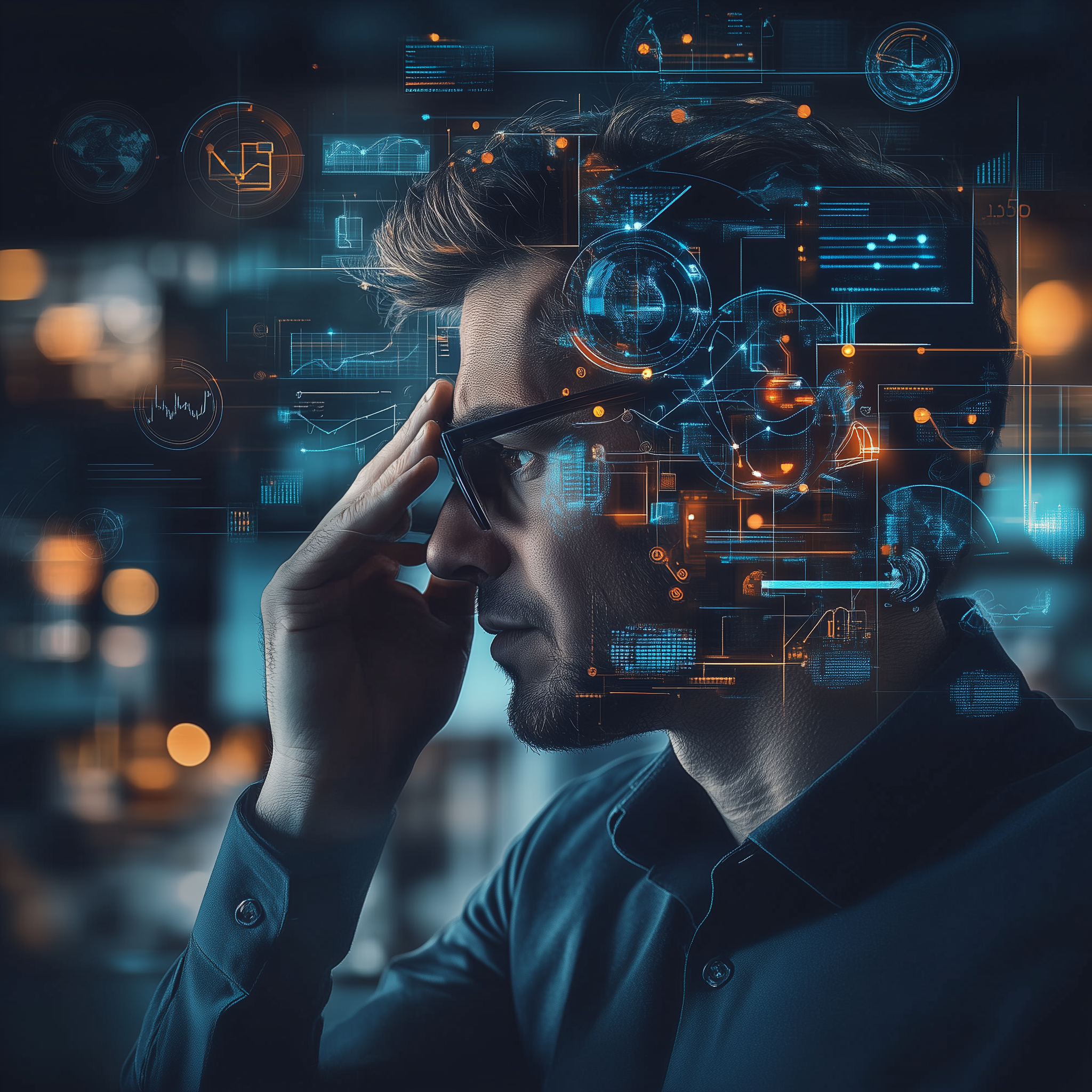The image presents a corporate director visibly stressed, one hand on their forehead amidst swirling abstract elements. Deep blues and greys dominate the scene, representing the intense mental strain in a modern office environment.