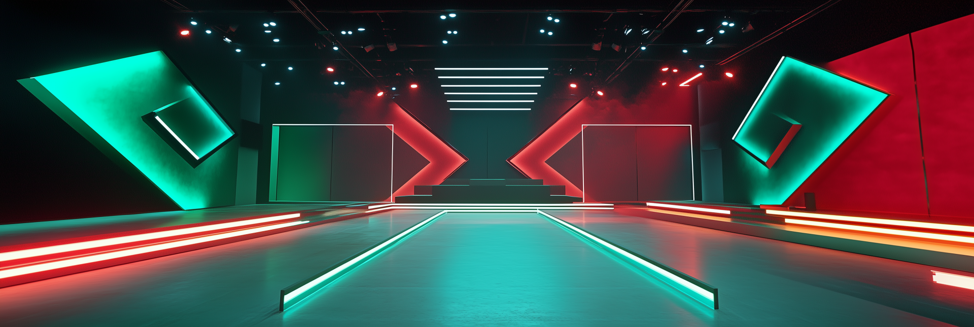 This image captures a modern TV studio set that feels dynamic and engaging. The bold use of green and red lighting creates a visually striking atmosphere, enhanced by glowing neon elements and geometric patterns.
