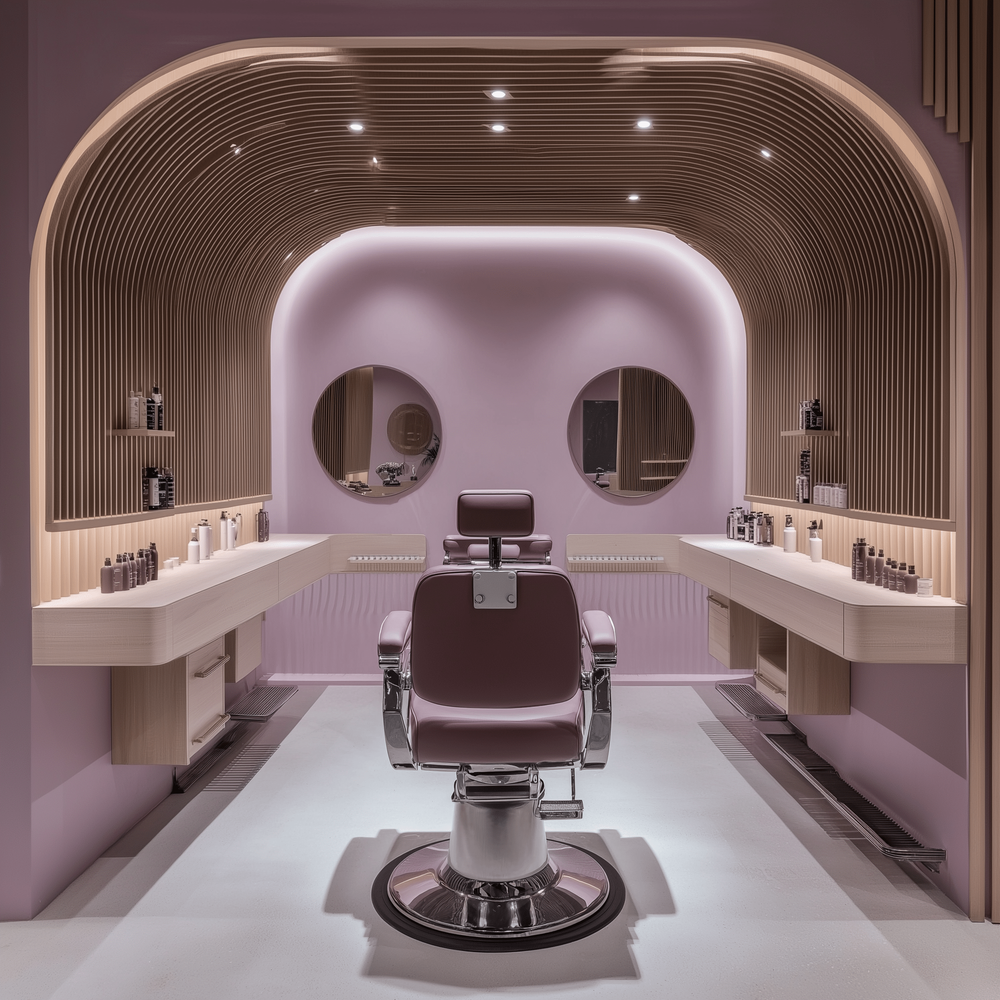 A spacious barber salon with a modern and welcoming mood, featuring a minimalistic and warming design. The color palette is predominantly lavender, adding a smooth and cozy atmosphere to the space.
