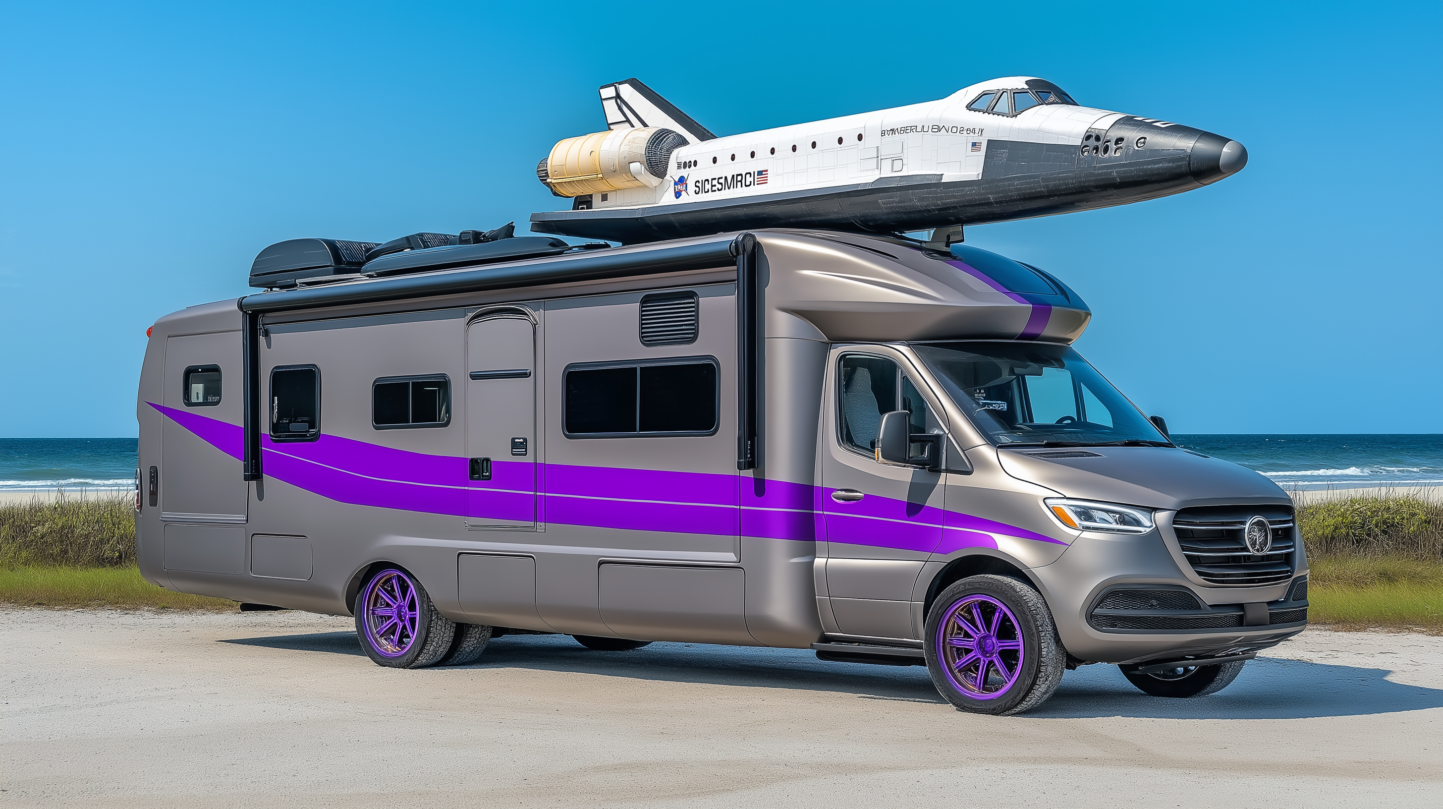 This realistic photo showcases a sleek modern RV with a unique purple stripe. The RV features a striking rocket design reminiscent of a Space Shuttle atop it, set against a bright blue sky on a clear summer's day.