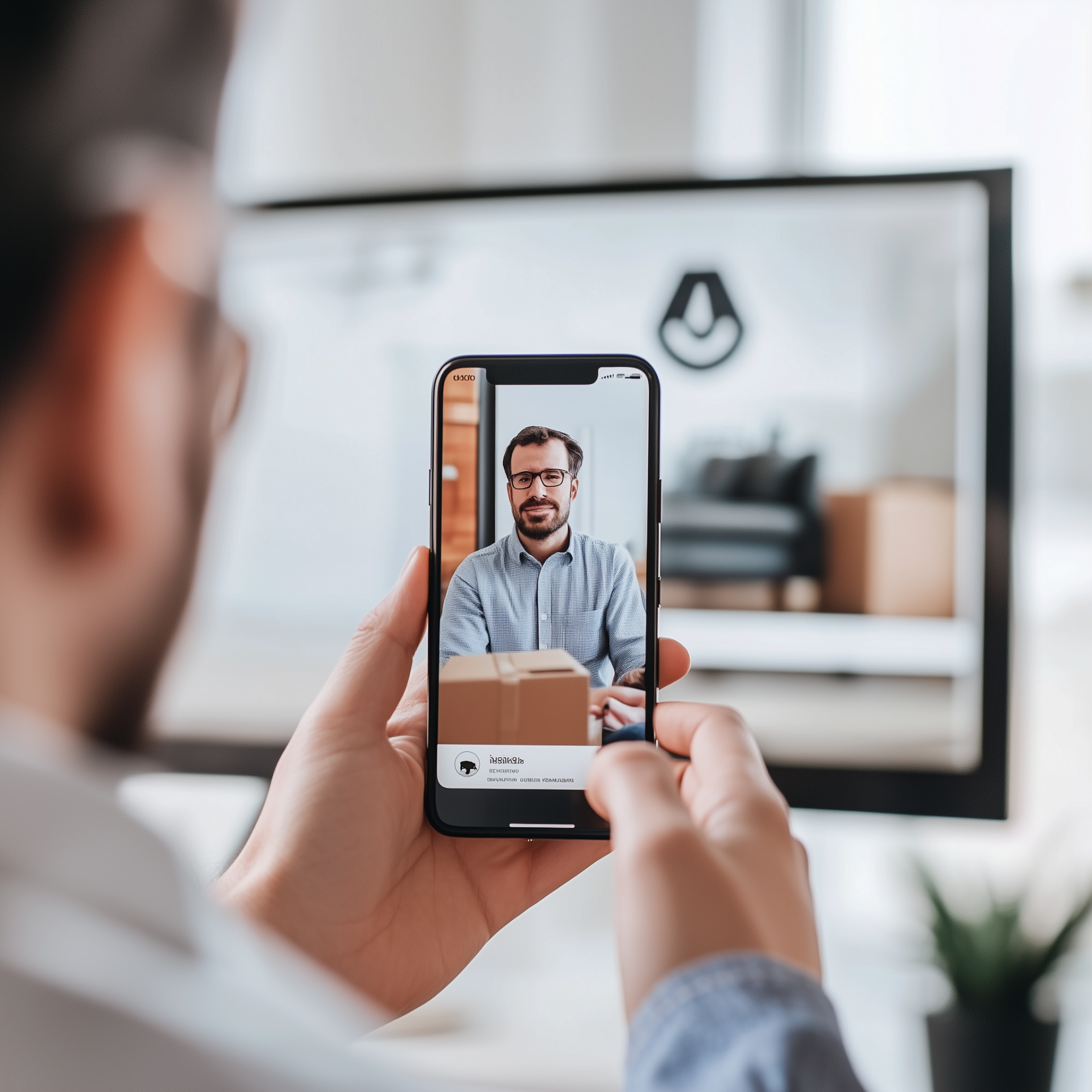 The scene presents a modern individual holding a smartphone, intently watching a video testimonial. A clean white background emphasizes the focus on the device and the engaging digital content.