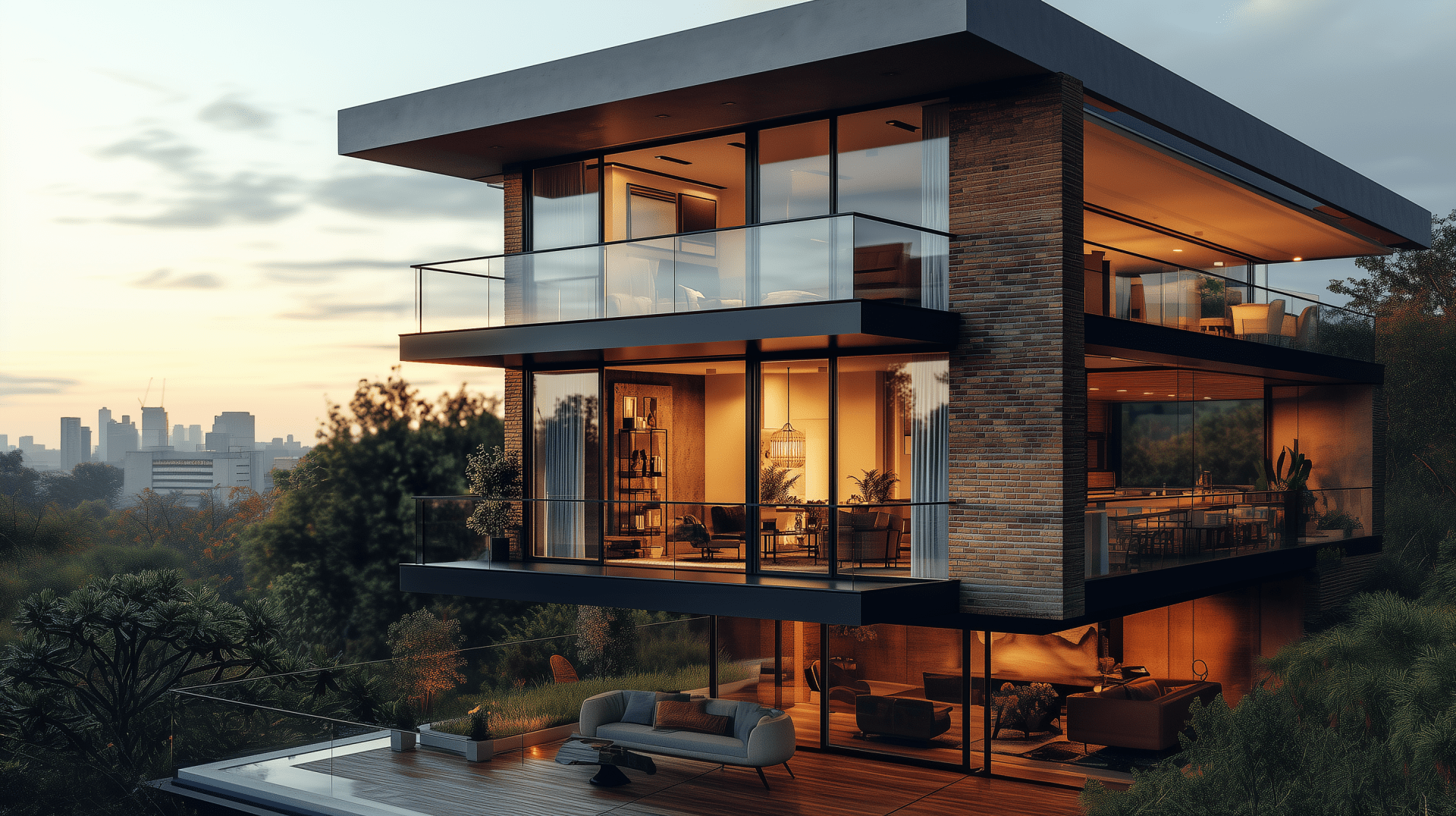 This image captures a cinematic view of a balcony adorned with high-quality glass elements. The perspective, taken from a drone, evokes a sense of openness and modern living in a contemporary environment.
