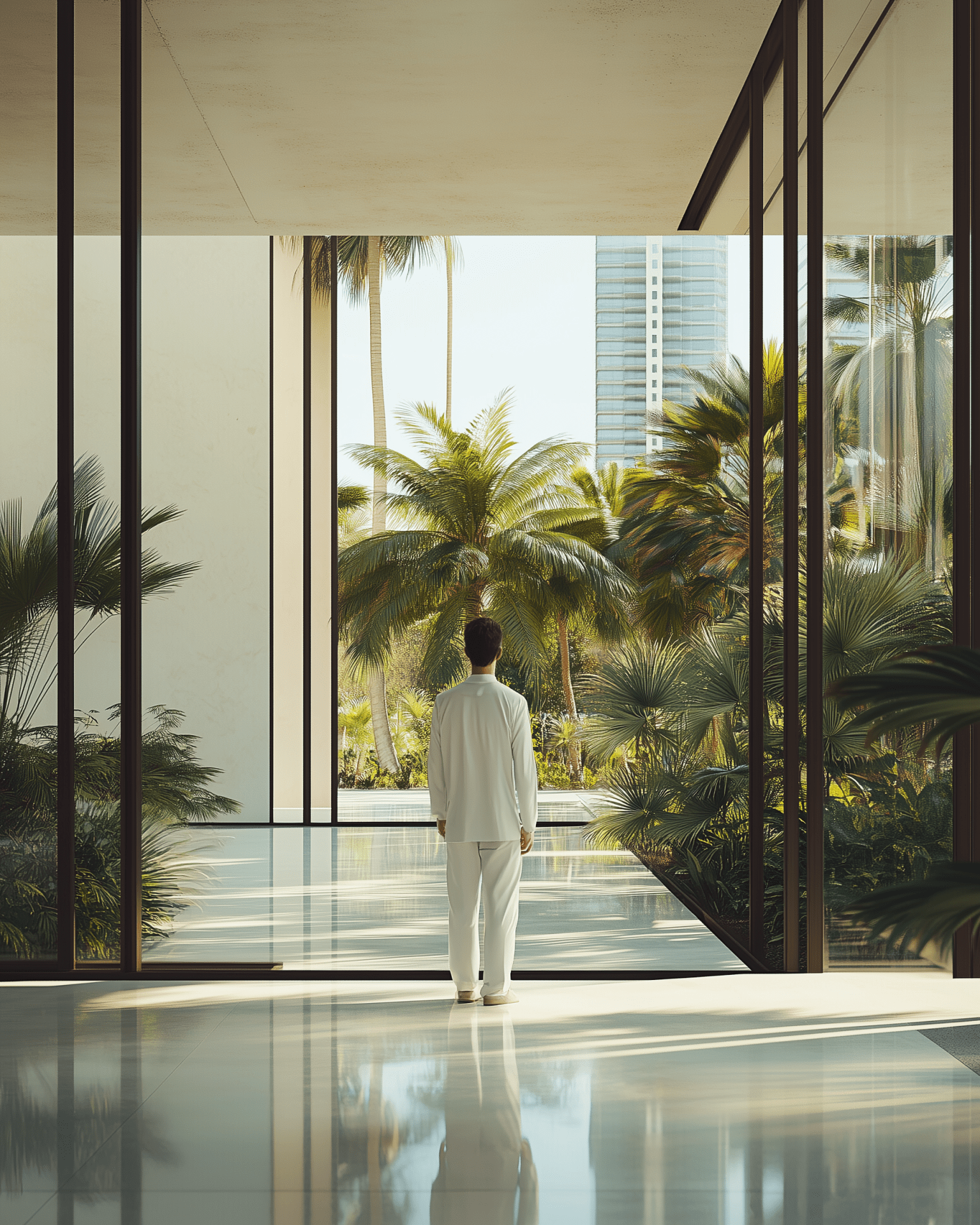 A man dressed in white stands in a sleek modern mansion, captivated by the lush greenery and palm trees beyond the large windows. The bright sunlight casts a radiant glow on his figure, creating a cinematic atmosphere with an expansive urban landscape in view.