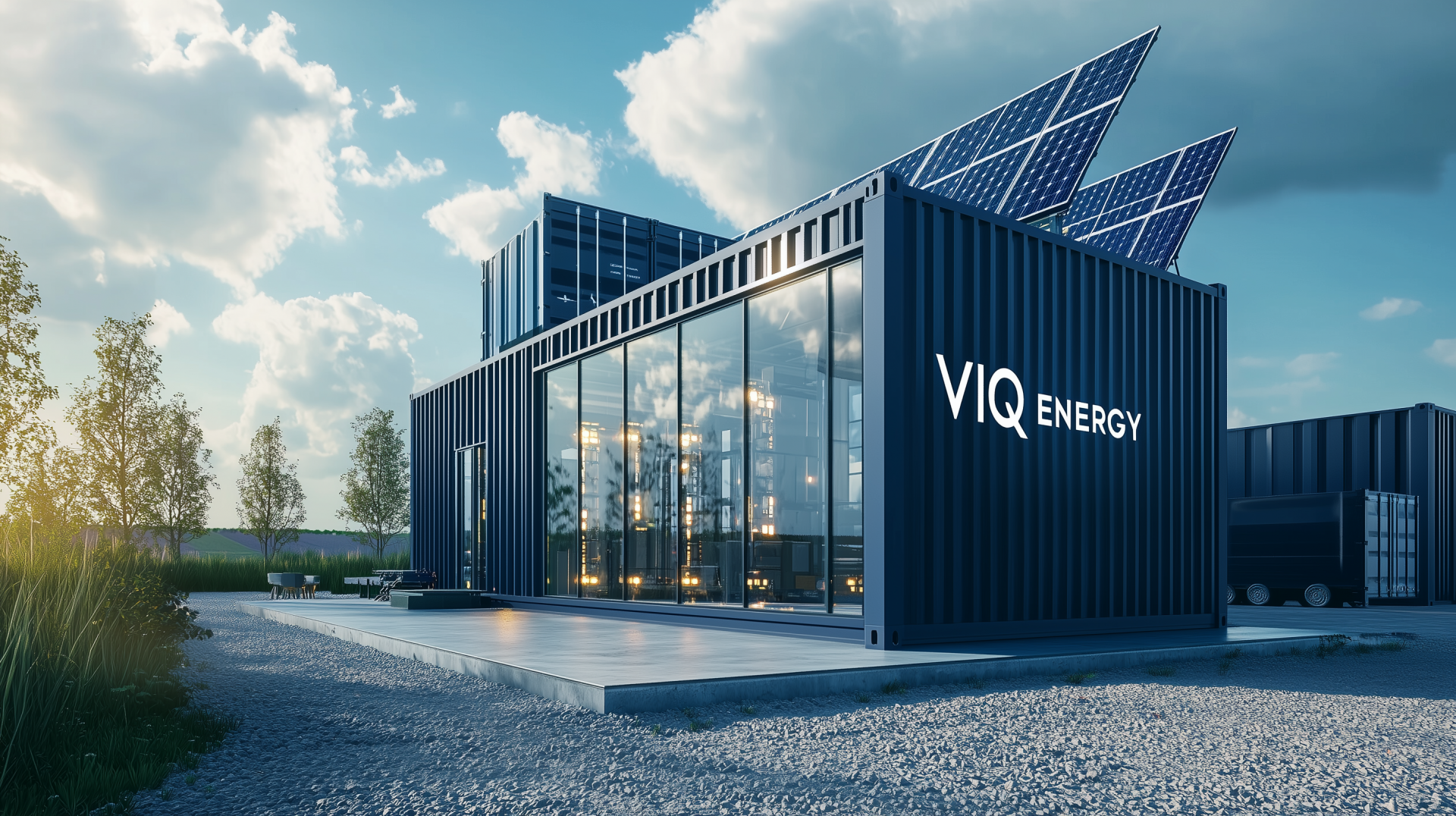 The image showcases a sleek modern container office featuring large glass windows that reflect sunlight. The surroundings are clean with gravel and concrete, and the vibrant blue sky adds to the corporate aesthetic.