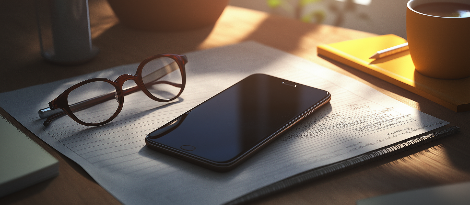 The image showcases a modern office desk setup with a cell phone placed on a table surrounded by papers, a pencil, a notebook, and glasses. A cup of coffee rests nearby, creating a cozy and productive atmosphere.
