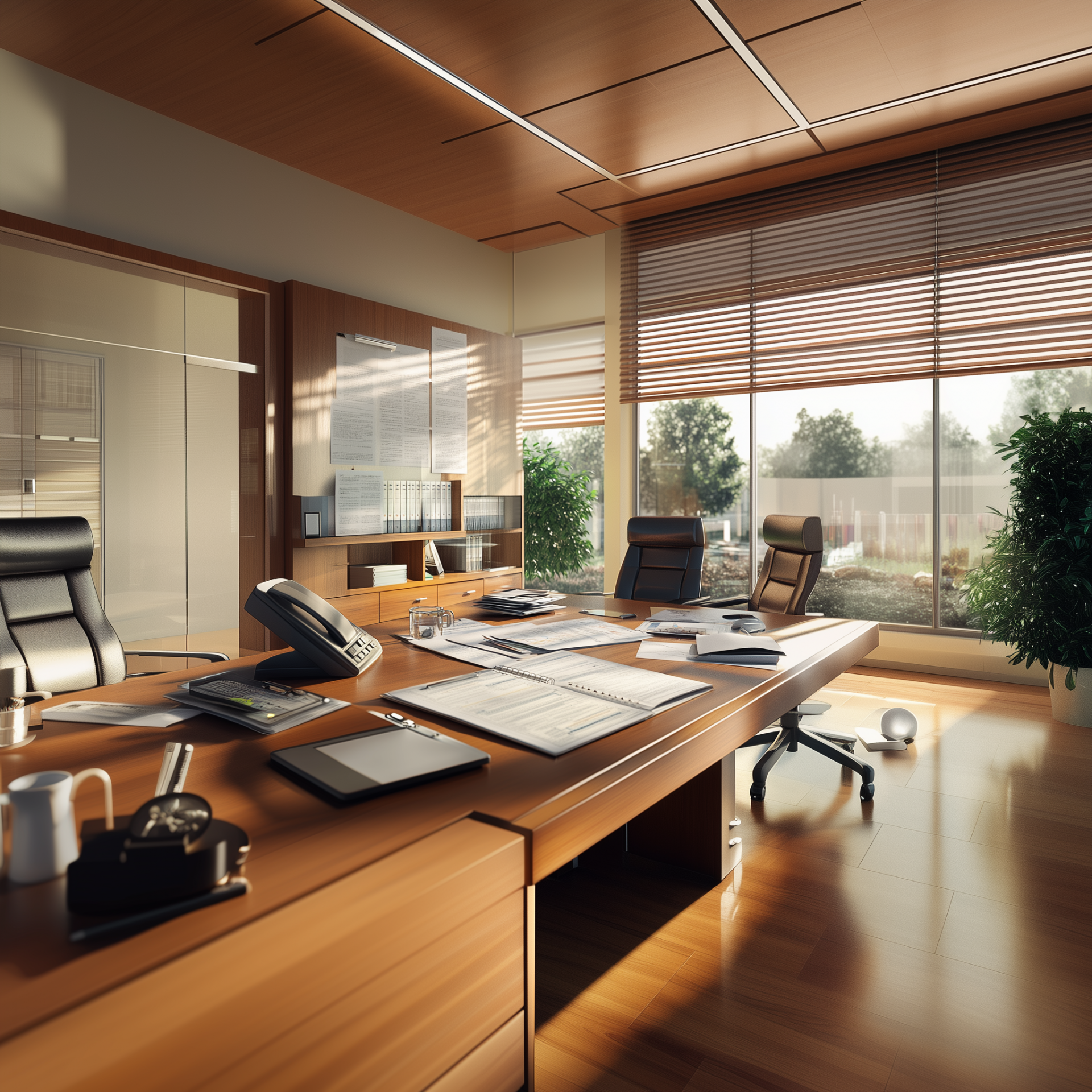A photorealistic depiction of a modern tax adviser office featuring neatly organized papers on a sleek desk. The workspace exudes a professional and minimalist atmosphere, designed for productivity and organization.