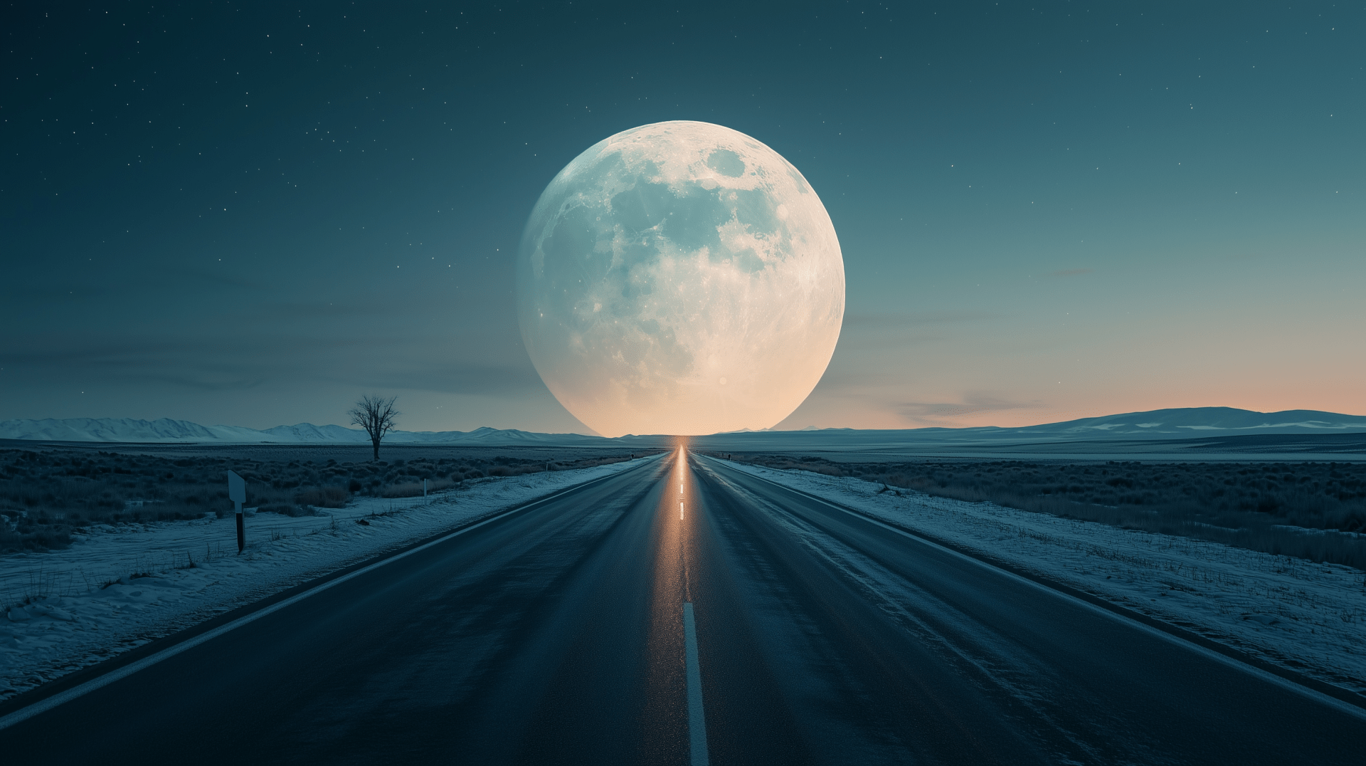 The image depicts a long road illuminated by light, leading towards a large, partially hidden moon on the horizon. The scene embodies a serene and atmospheric feel, with a clear sky enhancing the dramatic presence of the moon.