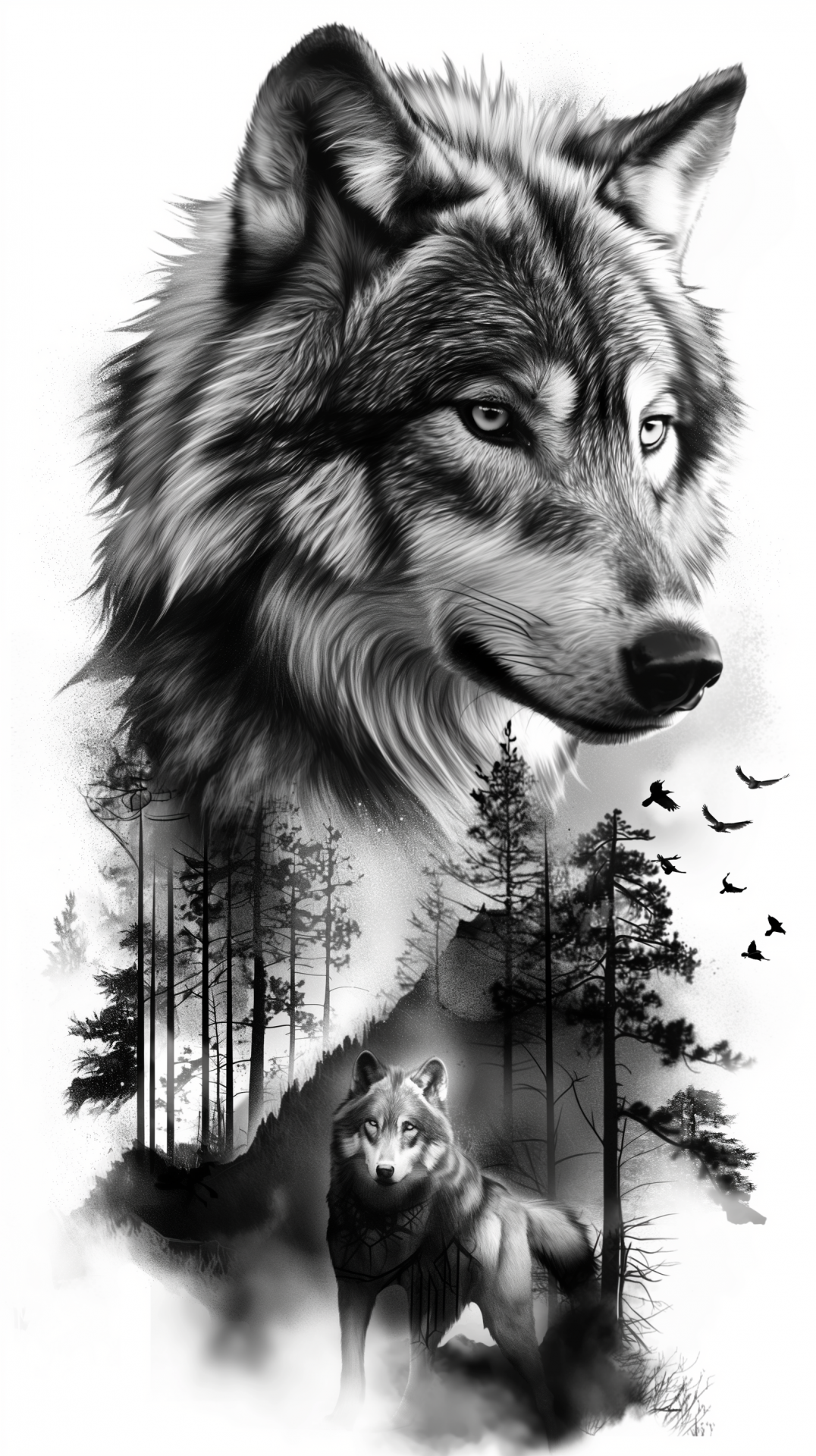 This illustration showcases a hyper-realistic wolf crafted with intricate black and white shading. The wolf's face exudes wisdom and power, set against a mystical forest with fog and soft rays of light, adding to the ethereal feel of the design.
