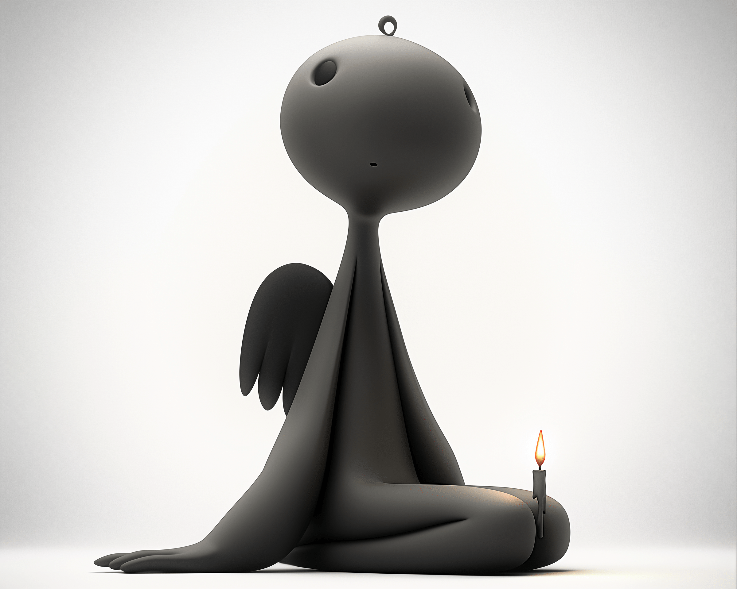 This illustration depicts a minimalist angel candle holder with a smooth silhouette and ethereal wings. The figure is rendered in soft grayscale, exuding a serene and mysterious aura, while it holds a small candleholder above its head.