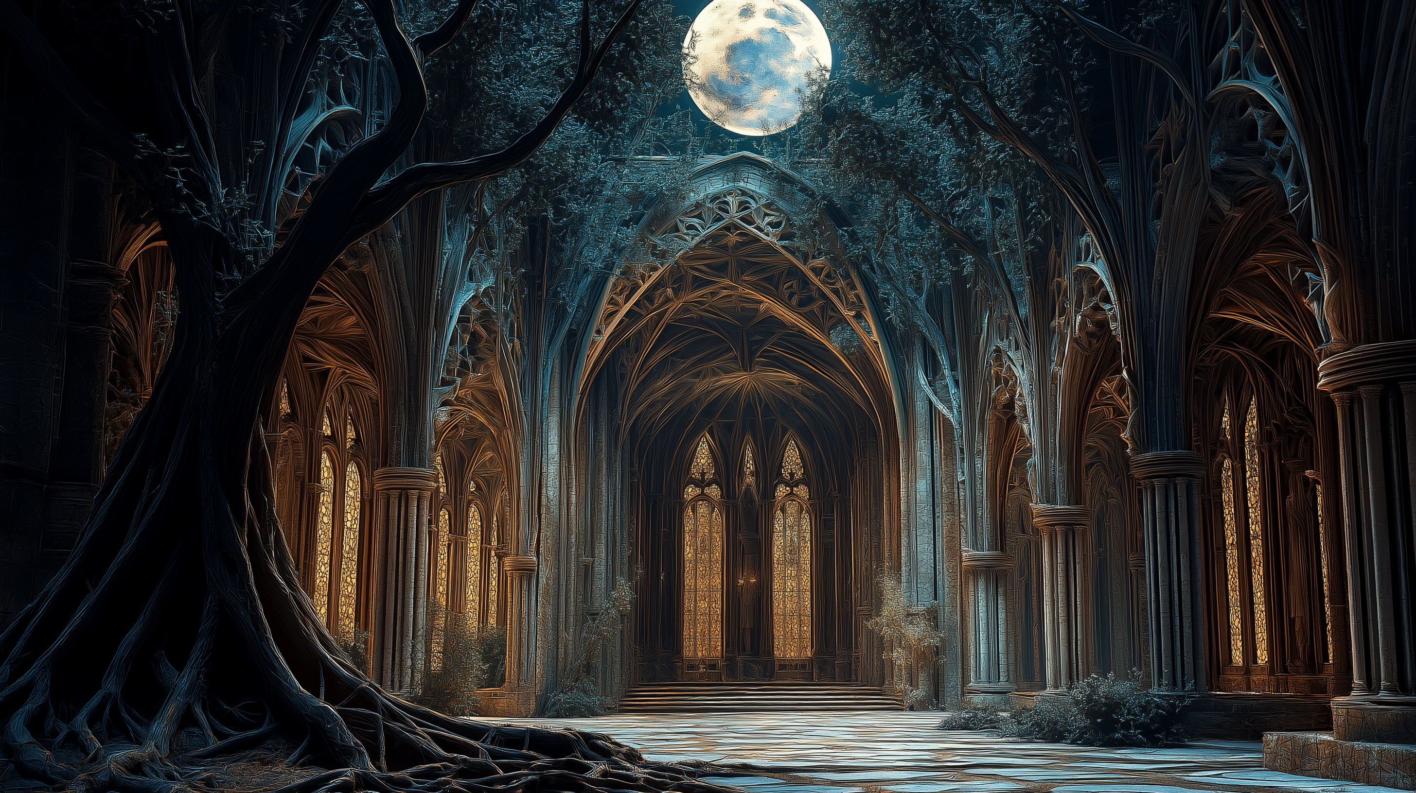 This image depicts a grand gothic hall filled with towering arches that resemble tree roots at the base. The scene is set at night, illuminated by the gentle glow of moonlight, creating a mystical atmosphere.