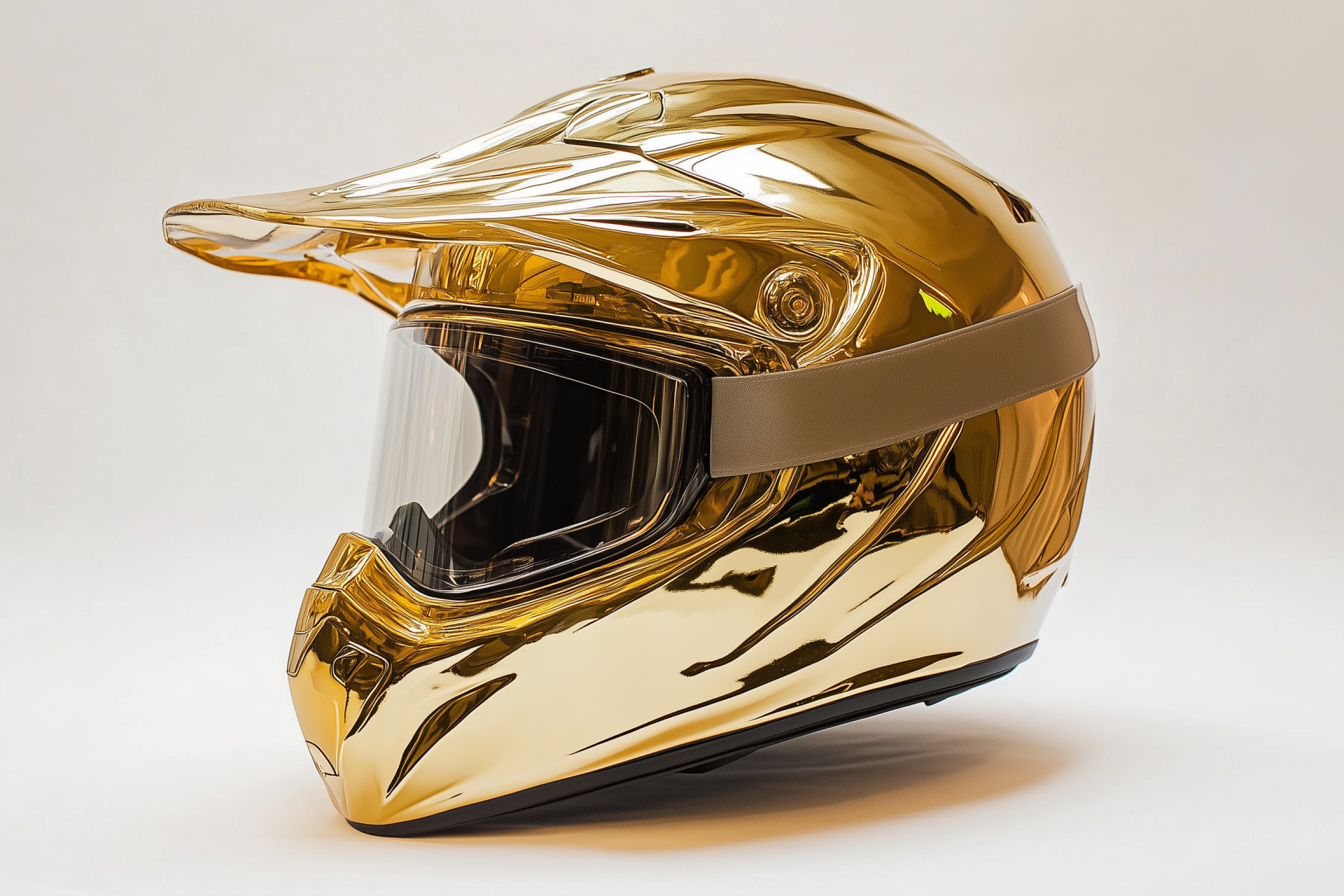 The image features a hyper-realistic chrome gold motocross helmet prominently displayed against a clean white background. Light from above glistens off the helmet's surface, enhancing its shiny and reflective details.