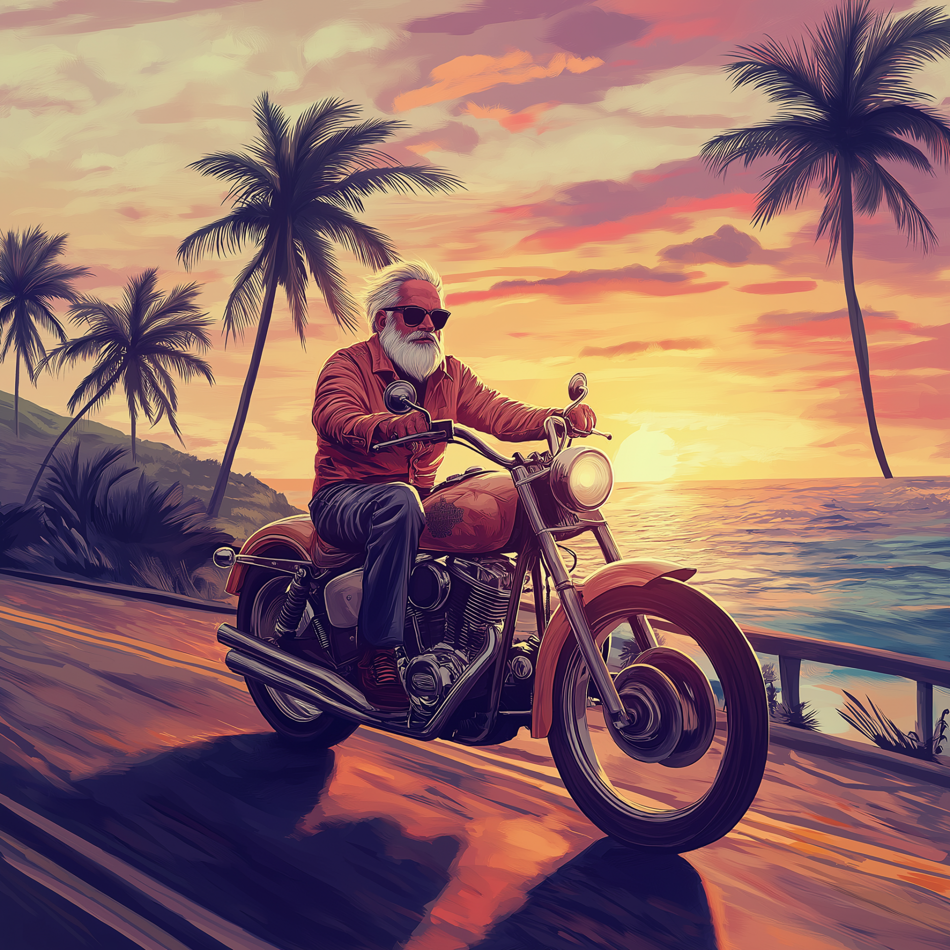 The image captures an older man confidently riding a motorcycle along a scenic ocean-side highway. Palm trees sway gently in the background as a vibrant sunset paints the sky with warm hues.